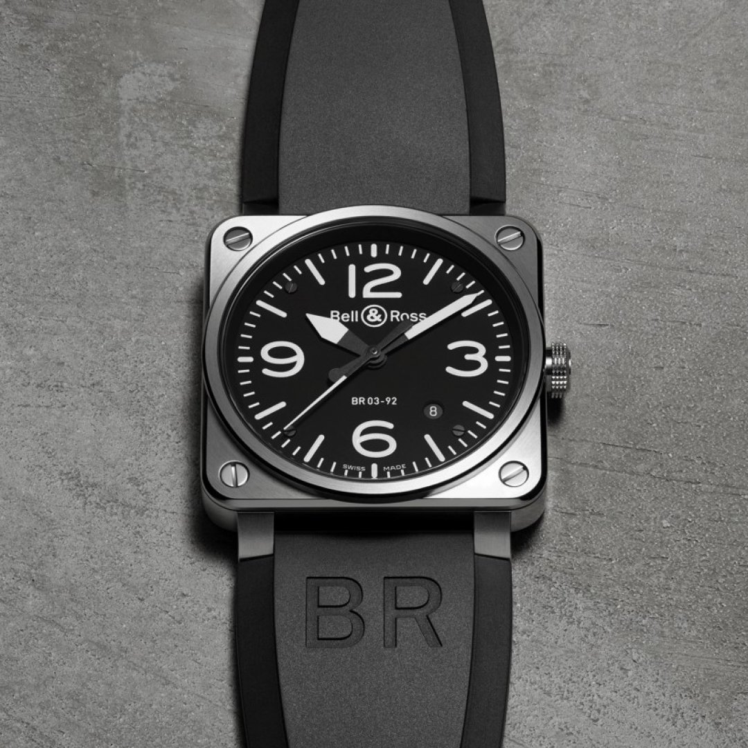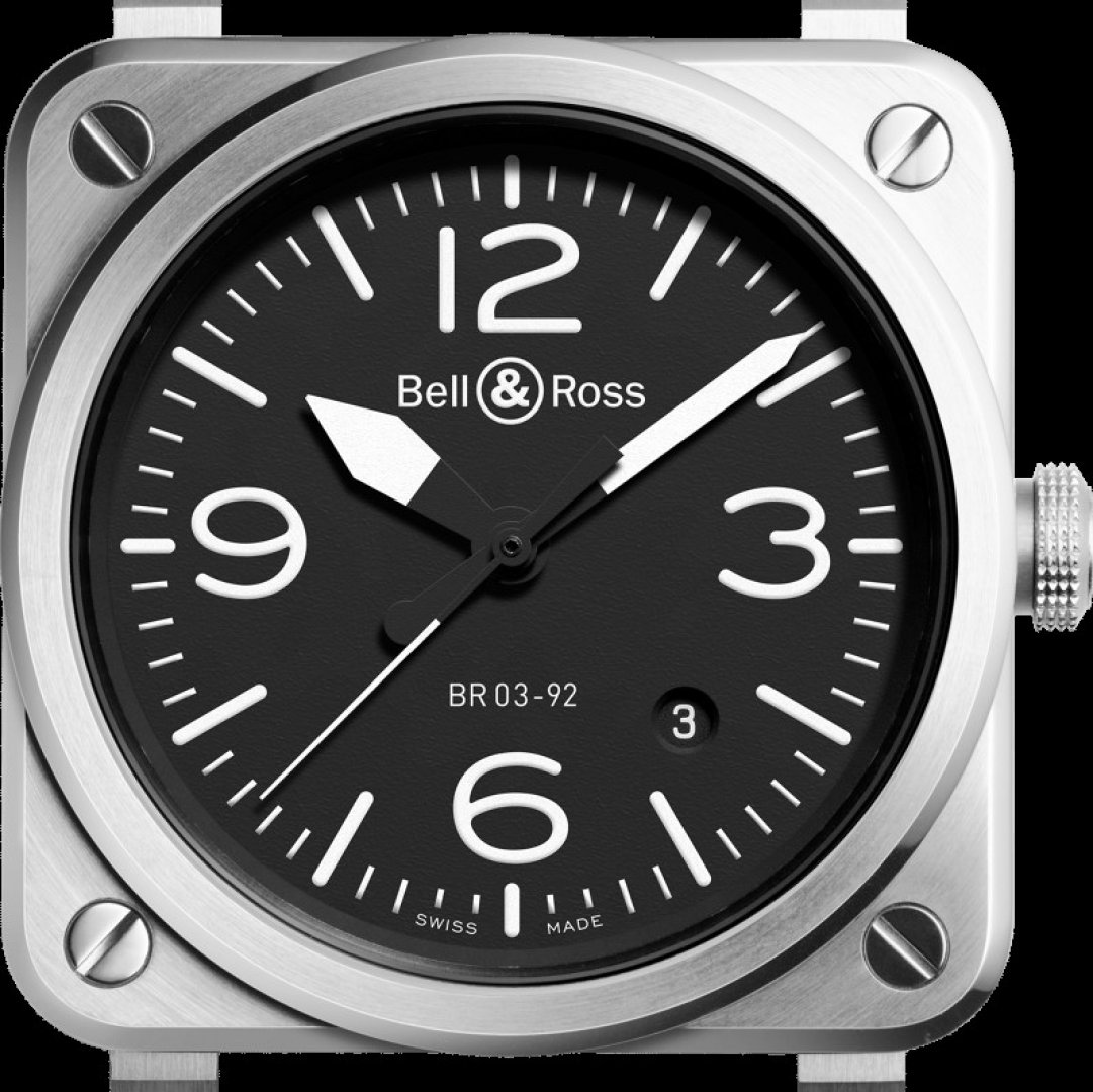 luxusné hodinky Bell & Ross BR 03 AUTO BLACK STEEL Oceľ, 42 mm. Hodinky disponujú funkciami luminiscencia a ukazovateľ dátumu. Základné parametre hodín sú: farba ciferníka je čierna, typ strojčeka je mechanické hodinky s automatickým náťahom, materiál remienka je textil a silikon a vode odolnosť je 100 m.