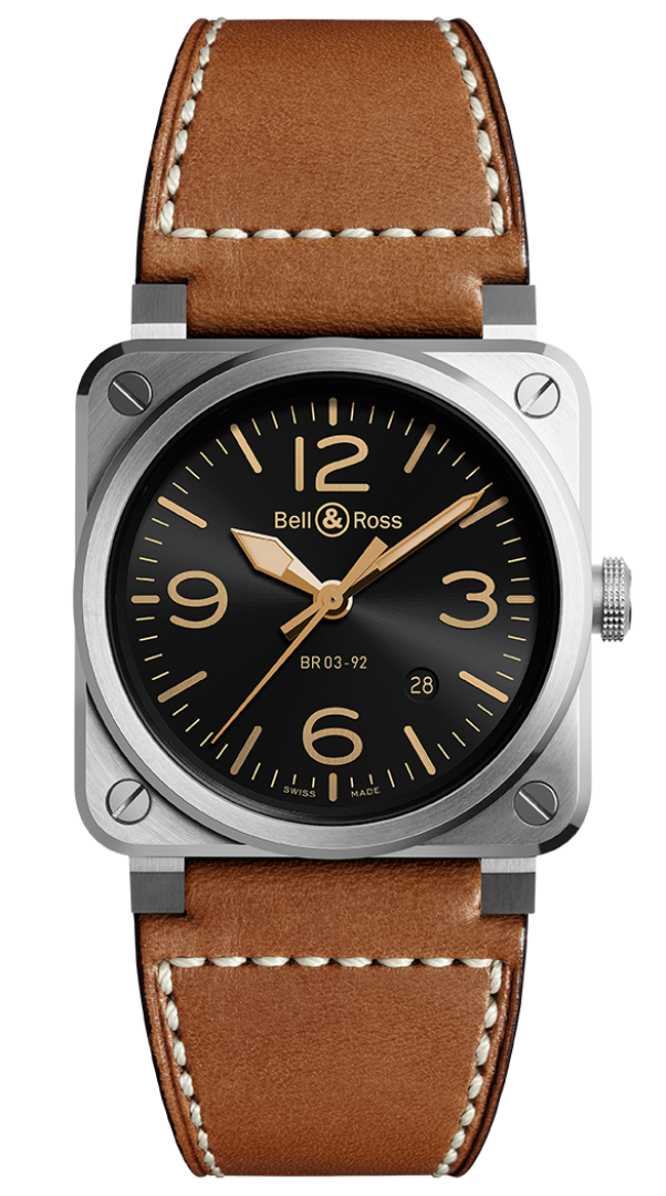 luxusné hodinky Bell & Ross BR 03 AUTO GOLDEN HERITAGE Oceľ, 42 mm. Hodinky disponujú funkciami luminiscencia a ukazovateľ dátumu. Základné parametre hodín sú: farba ciferníka je čierna, typ strojčeka je mechanické hodinky s automatickým náťahom, materiál remienka je textil a koža a vode odolnosť je 100 m.