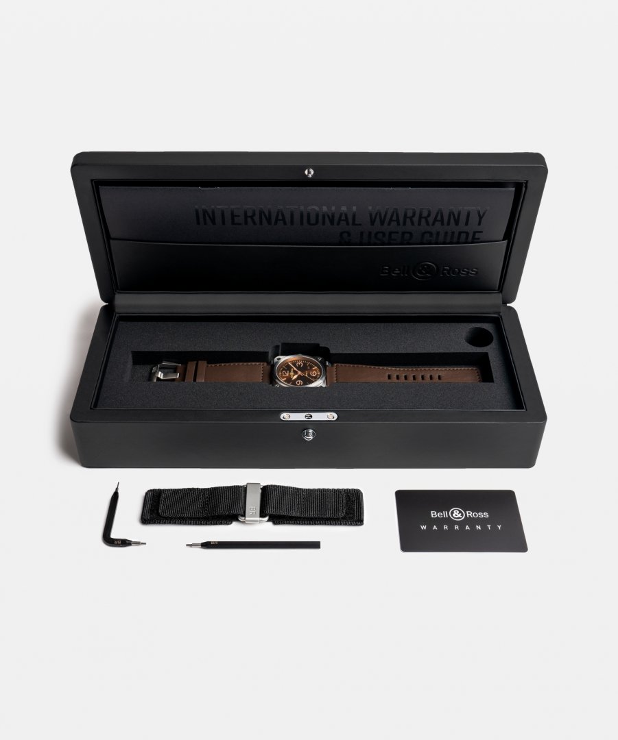 luxusné hodinky Bell & Ross BR 03 AUTO GOLDEN HERITAGE Oceľ, 41 mm. Hodinky disponujú funkciami luminiscencia a ukazovateľ dátumu. Základné parametre hodín sú: typ strojčeka je mechanické hodinky s automatickým náťahom, vode odolnosť je 100 m, materiál remienka je koža a textil a farba ciferníka je hnědá.