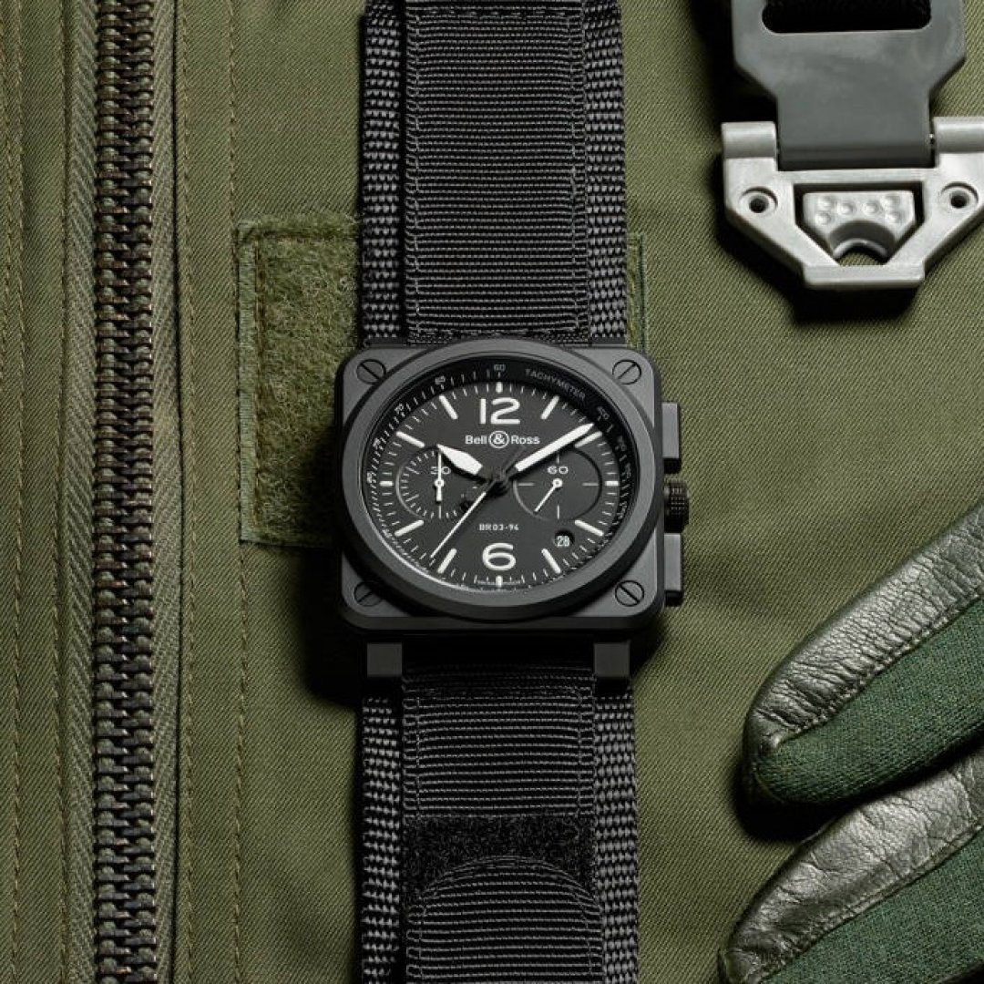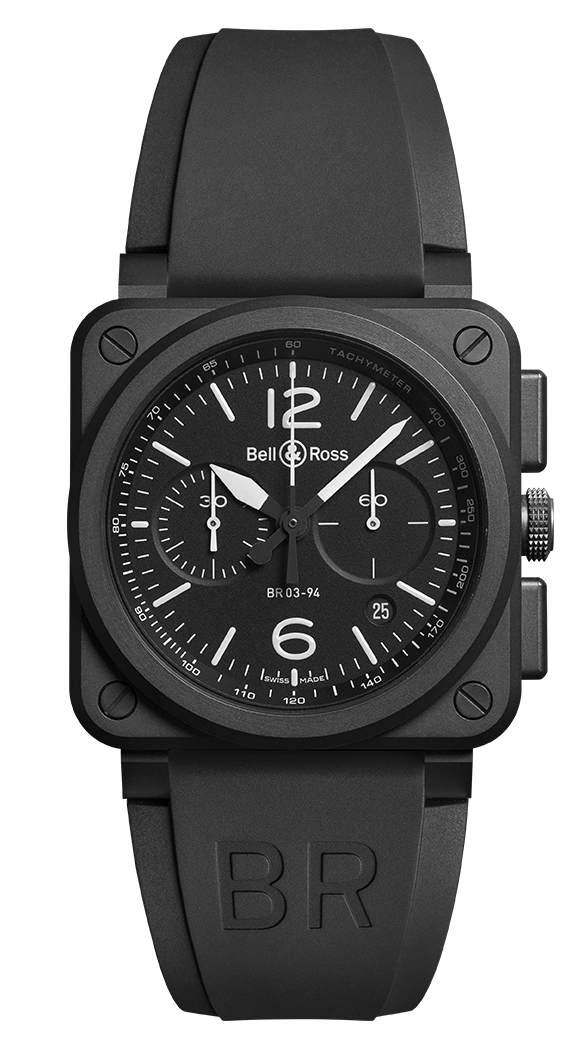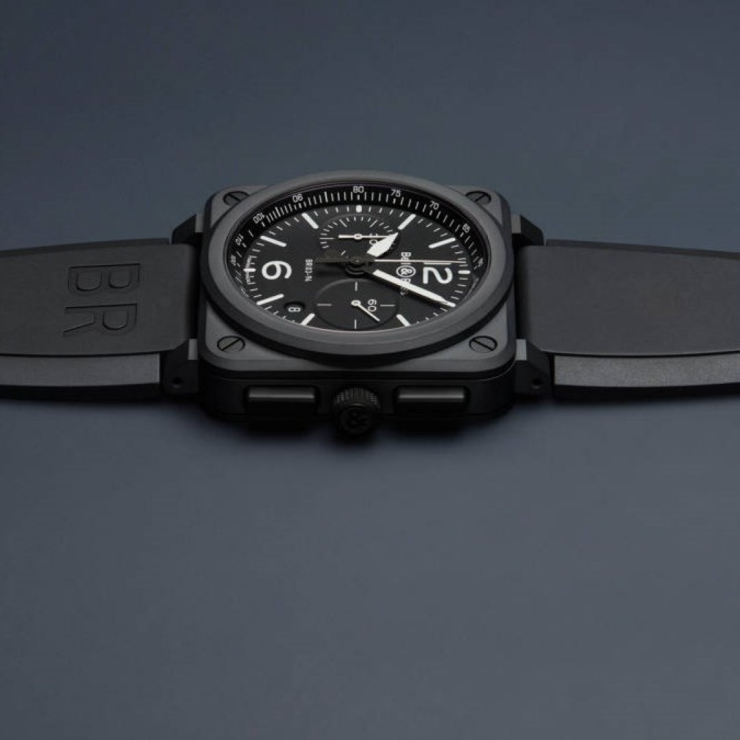 luxusné hodinky Bell & Ross BR 03 CHRONO BLACK MATTE Keramika, Automat, 42 mm. Hodinky disponujú funkciami luminiscencia, ukazovateľ dátumu a stopky. Základné parametre hodín sú: farba ciferníka je čierna, vode odolnosť je 100 m, typ strojčeka je mechanický chronograf s automatickým náťahom a materiál remienka je kaučuk.