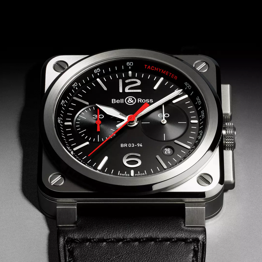 luxusné hodinky Bell & Ross BR 03 CHRONO BLACK STEEL Oceľ, 42 mm. Hodinky disponujú funkciami luminiscencia, ukazovateľ dátumu a stopky. Základné parametre hodín sú: farba ciferníka je čierna, vode odolnosť je 100 m, typ strojčeka je mechanický chronograf s automatickým náťahom a materiál remienka je kaučuk a koža.