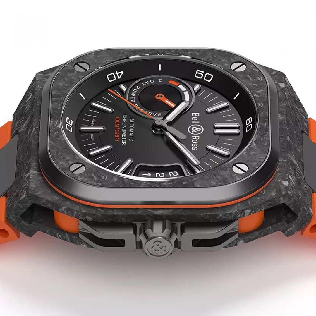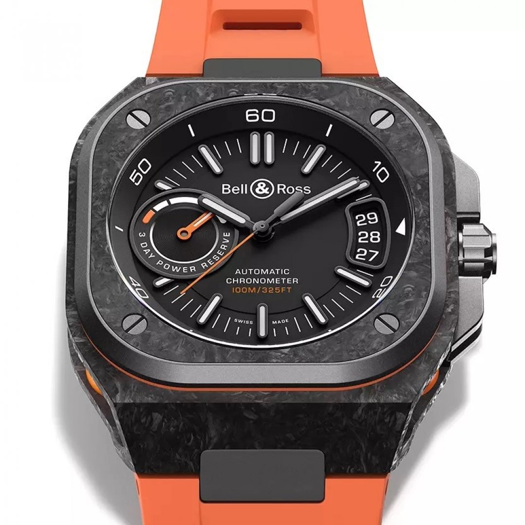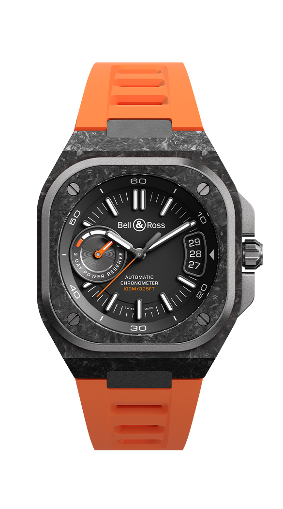 luxusné hodinky Bell & Ross BR-X5 CARBON ORANGE Karbonové puzdro, 41 MM. Hodinky disponujú funkciami luminiscencia, ukazovateľ dátumu a rezerva chodu. Základné parametre hodín sú: farba ciferníka je čierna, typ strojčeka je mechanické hodinky s automatickým náťahom, materiál remienka je kaučuk a vode odolnosť je 100 m.