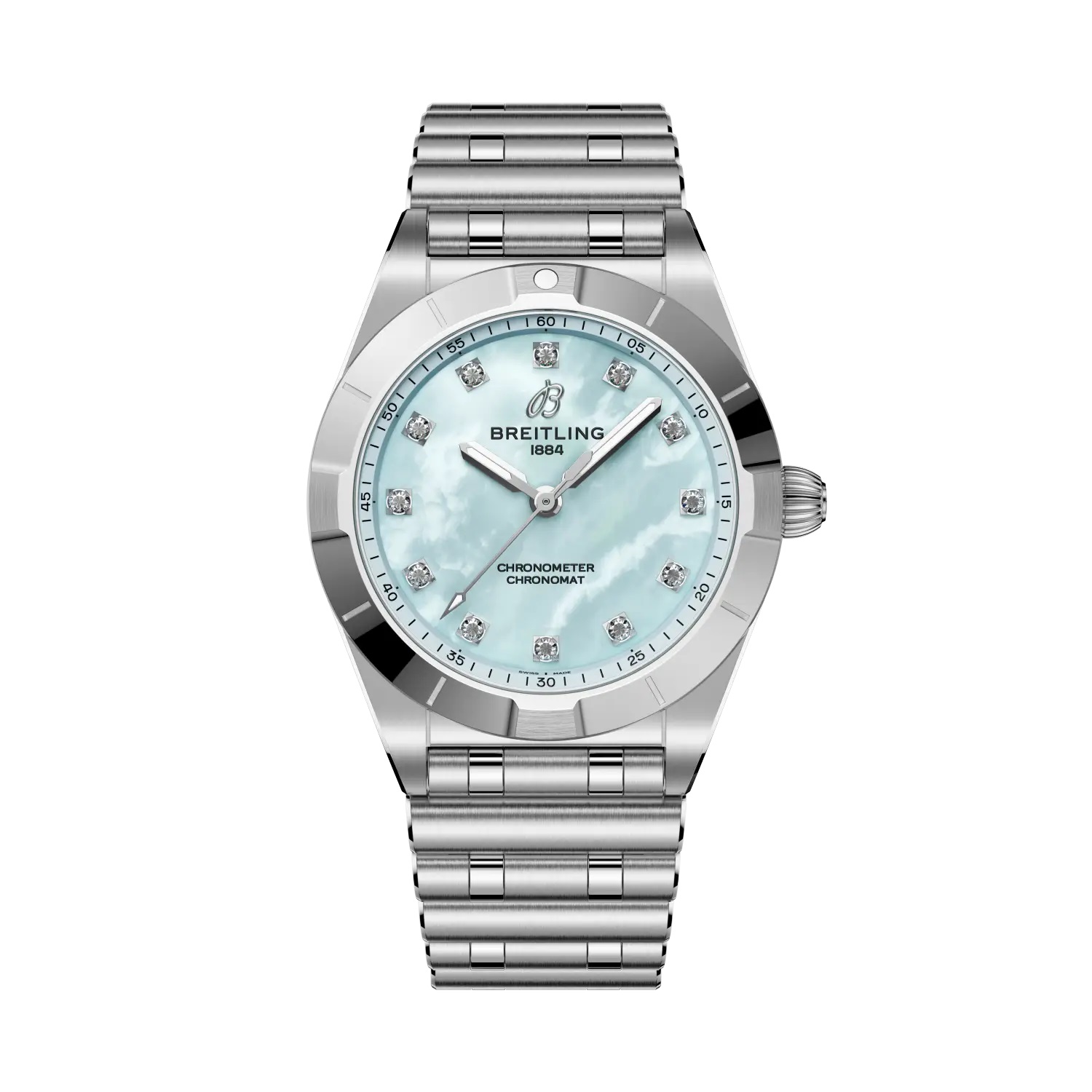 luxusné hodinky Breitling Chronomat 28 Diamanty, Quartz, 28 mm. Hodinky disponujú funkciami luminiscencia, ukazovateľ dátumu a E.O.L.. Základné parametre hodín sú: materiál remienka je oceľ, vode odolnosť je 100 m, typ strojčeka je Quartz hodinky a farba ciferníka je modrá.