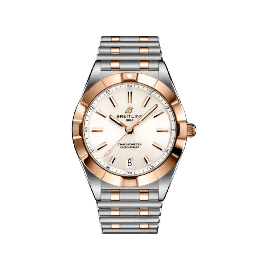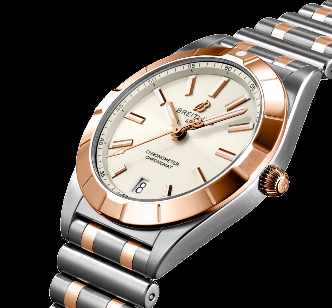 Luxusné hodinky Breitling Chronomat 32 Červené zlato, 32 MM. Hodinky disponujú funkciami luminiscencia, ukazovateľ dátumu a E.O.L.. Základné parametre hodín sú: materiál remienka je oceľ a zlato, vode odolnosť je 100 m a farba ciferníka je béžová.