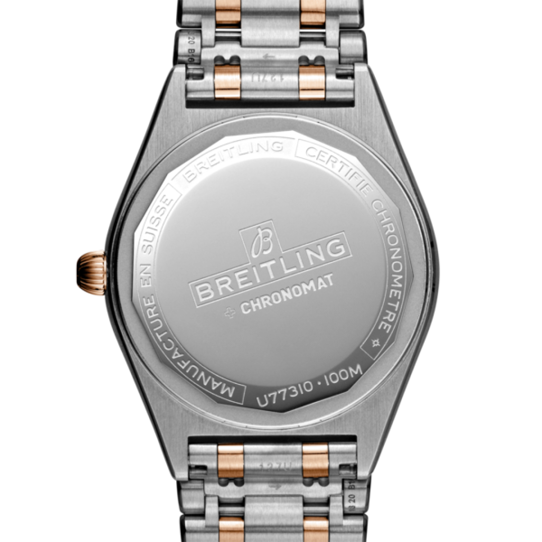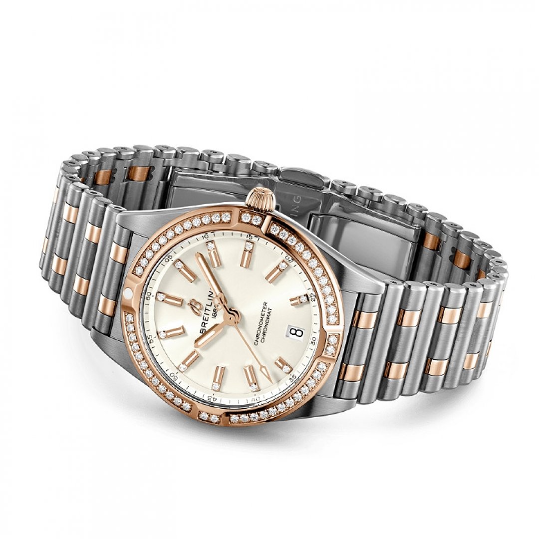 Luxusné hodinky Breitling Chronomat 32 Červené zlato & Diamanty, 32 MM. Hodinky disponujú funkciami luminiscencia, ukazovateľ dátumu a E.O.L.. Základné parametre hodín sú: materiál remienka je oceľ a zlato, vode odolnosť je 100 m, farba ciferníka je béžová a typ strojčeka je Quartz hodinky.