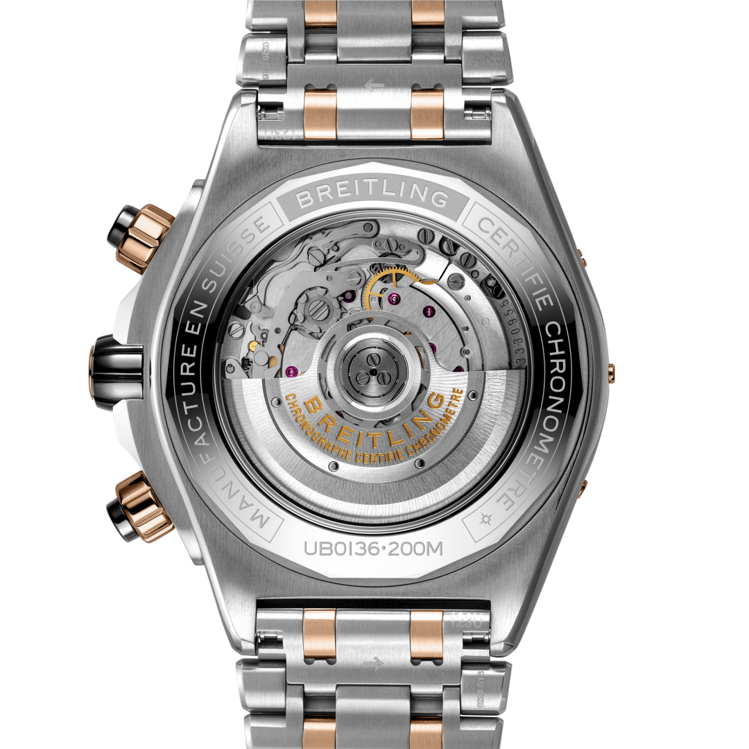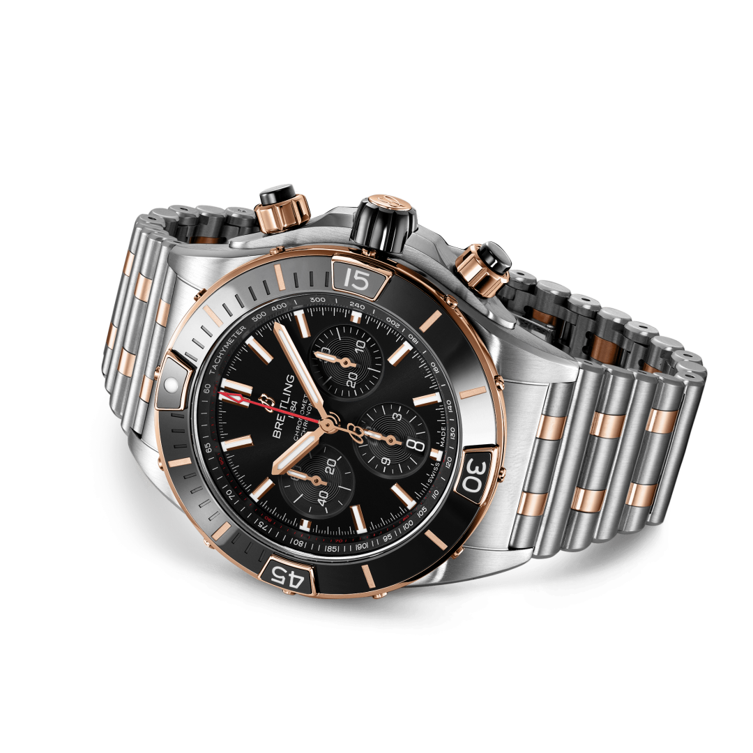 luxusné hodinky Breitling Chronomat Super Chronomat B01 Manufaktúrny kaliber, Vode odolnosť 200M, 44 mm. Hodinky disponujú funkciami luminiscencia, stopky, ukazovateľ dátumu a tachymeter. Základné parametre hodín sú: typ strojčeka je mechanický chronograf s automatickým náťahom, vode odolnosť je 200 m, farba ciferníka je čierna a materiál remienka je oceľ a zlato.