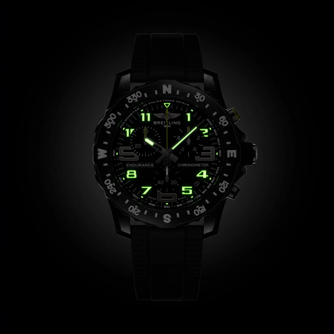 luxusné hodinky Breitling Endurance Pro Breitlight® - Black Ultra ľahké, 44 mm. Hodinky disponujú funkciami luminiscencia, stopky, ukazovateľ dátumu a E.O.L.. Základné parametre hodín sú: farba ciferníka je čierna, materiál remienka je kaučuk, vode odolnosť je 100 m a typ strojčeka je Quartz chronograf.