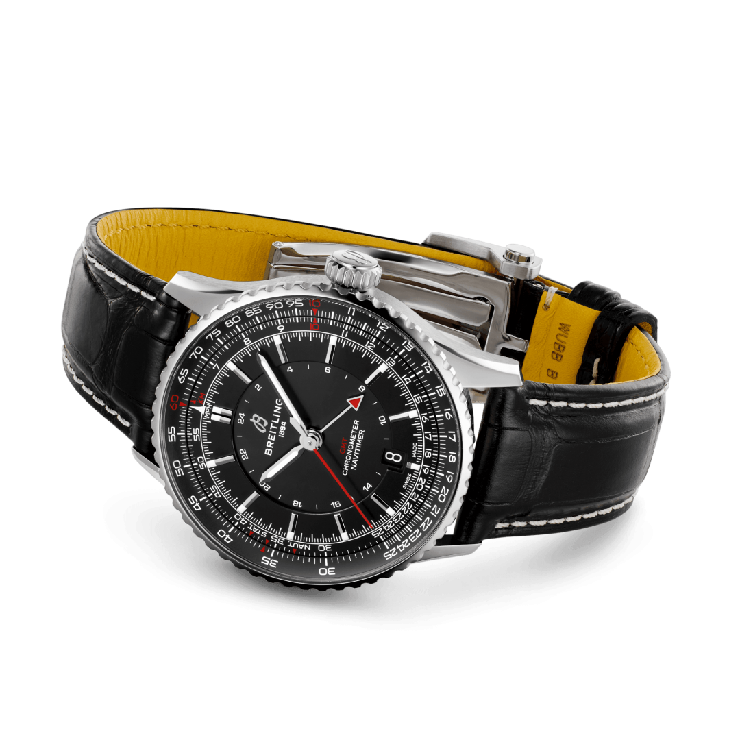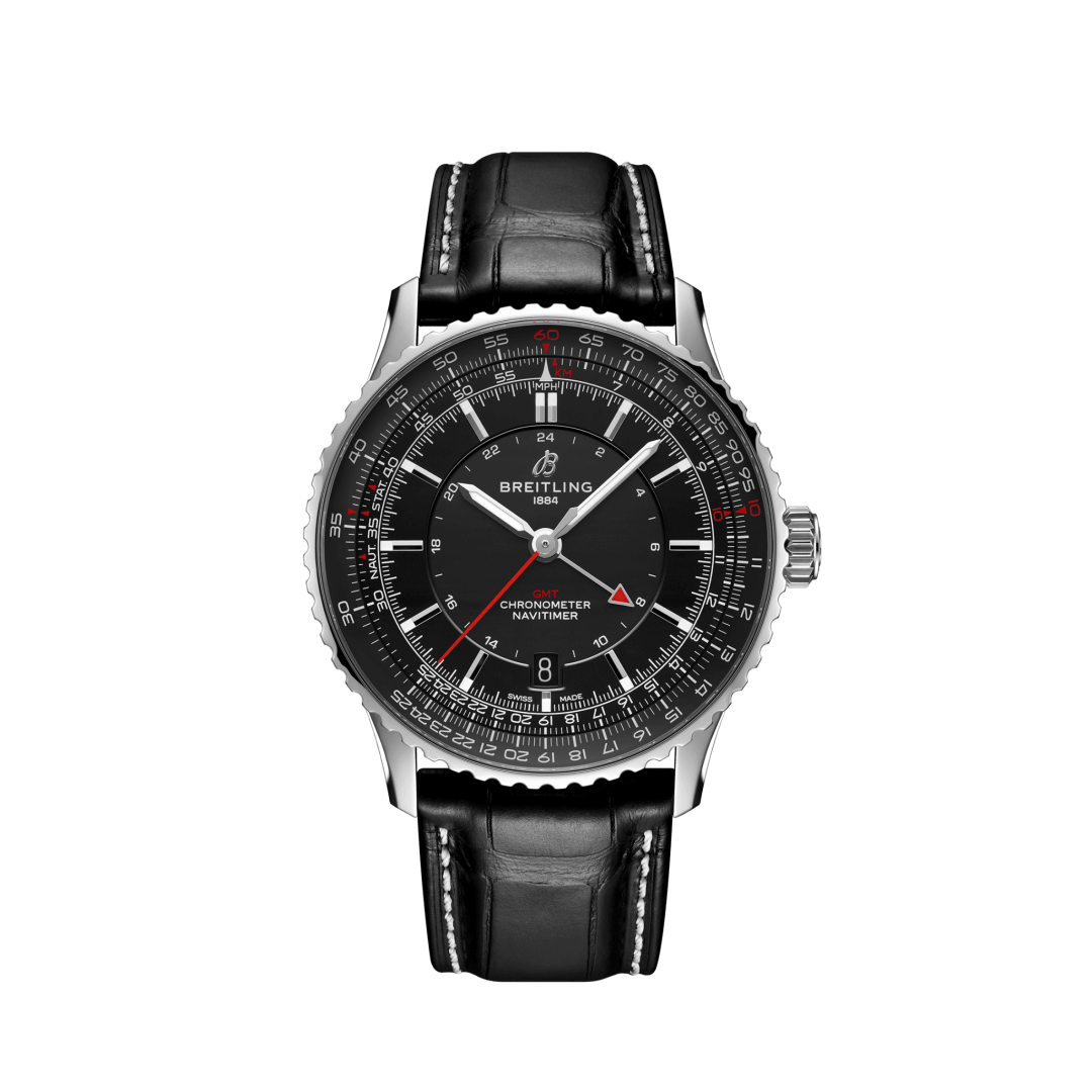 luxusné hodinky Breitling Navitimer GMT 41 Automat, 41 mm. Hodinky disponujú funkciami duálny čas, luminiscencia, ukazovateľ dátumu a logaritmické pravítko. Základné parametre hodín sú: farba ciferníka je čierna, typ strojčeka je mechanické hodinky s automatickým náťahom, materiál remienka je koža a vode odolnosť je 30 m.