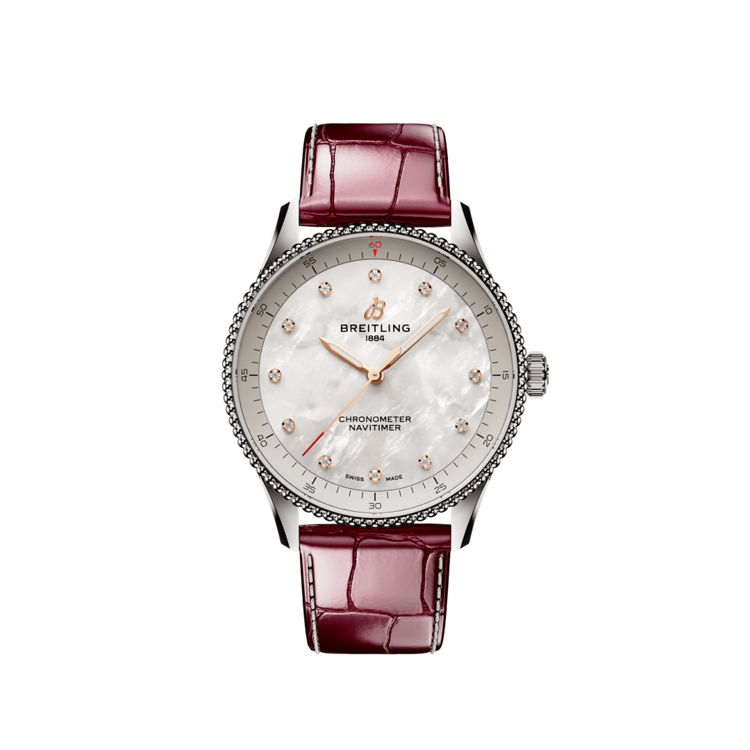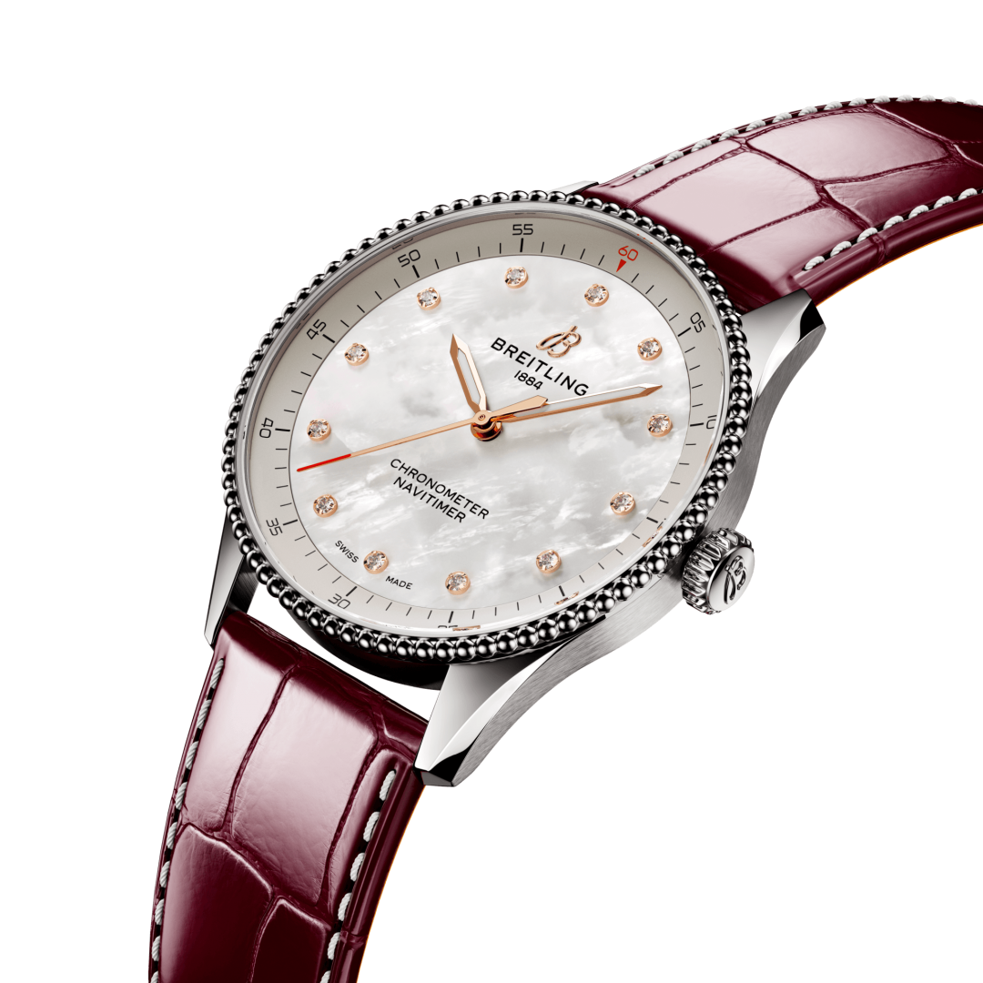 luxusné hodinky Breitling Navitimer 32 Diamanty, Quartz, 32 mm. Hodinky disponujú funkciami luminiscencia a E.O.L.. Základné parametre hodín sú: vode odolnosť je 30 m, farba ciferníka je perleť, typ strojčeka je Quartz hodinky a materiál remienka je koža.