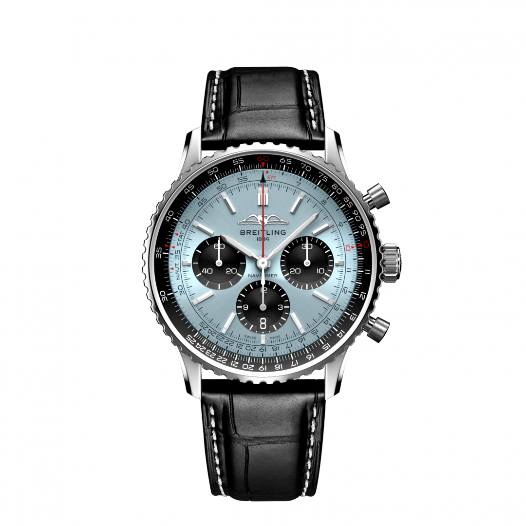 luxusné hodinky Breitling Navitimer B01 Chronograph 43 Manufaktúrny kaliber, 43 mm. Hodinky disponujú funkciami luminiscencia, stopky, ukazovateľ dátumu a logaritmické pravítko. Základné parametre hodín sú: typ strojčeka je mechanický chronograf s automatickým náťahom, vode odolnosť je 30 m, farba ciferníka je modrá a čierna a materiál remienka je koža.