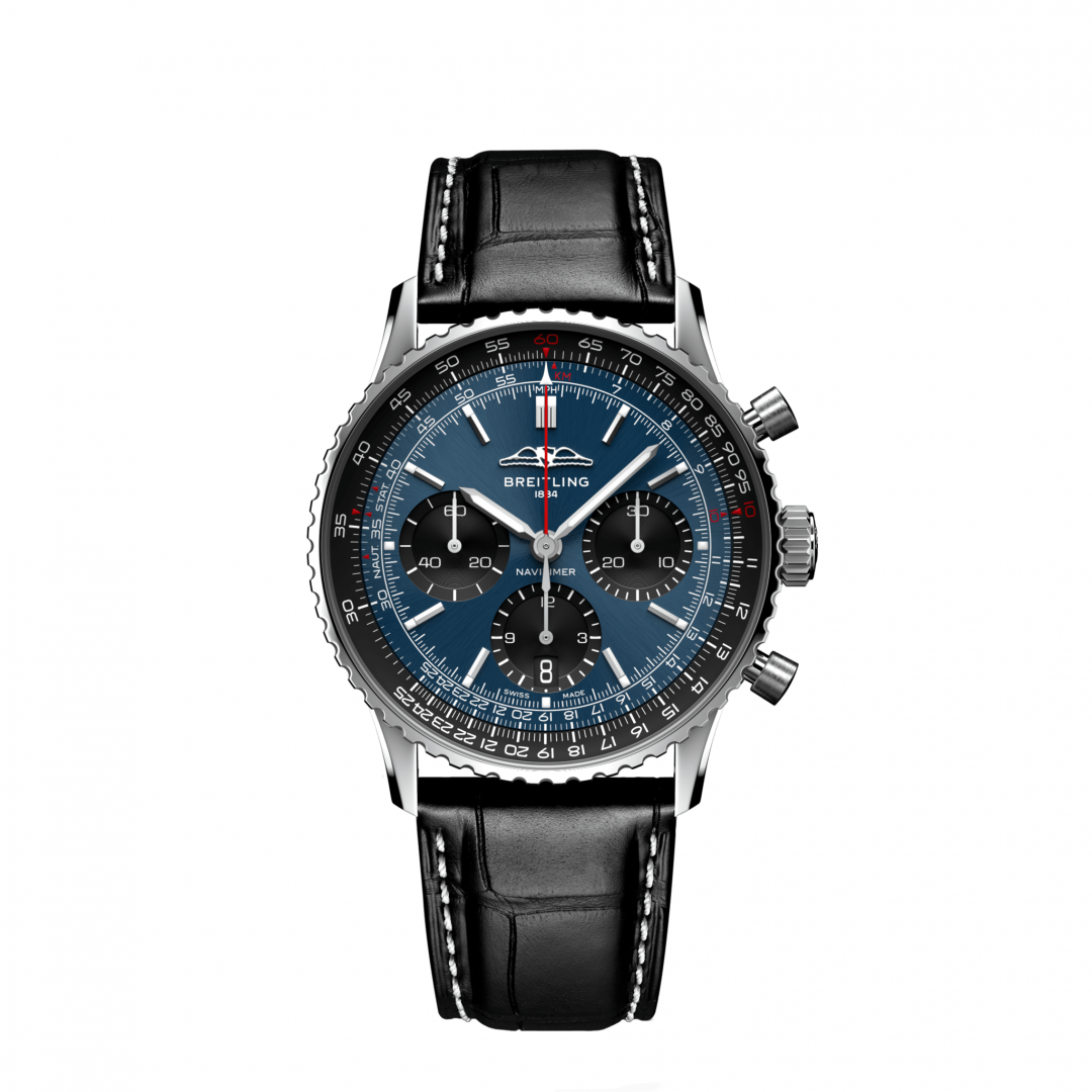luxusné hodinky Breitling Navitimer B01 Chronograph 41 Manufaktúrny kaliber, 41 mm. Hodinky disponujú funkciami luminiscencia, stopky, ukazovateľ dátumu a logaritmické pravítko. Základné parametre hodín sú: typ strojčeka je mechanický chronograf s automatickým náťahom, vode odolnosť je 30 m, farba ciferníka je čierna a modrá a materiál remienka je koža.