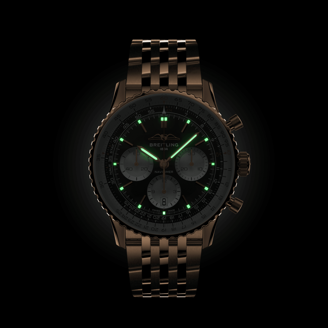 luxusné hodinky Breitling Navitimer B01 Chronograph 43 Zlato, Manufaktúrny kaliber, 43 mm. Hodinky disponujú funkciami luminiscencia, stopky, ukazovateľ dátumu a logaritmické pravítko. Základné parametre hodín sú: typ strojčeka je mechanický chronograf s automatickým náťahom, vode odolnosť je 30 m, farba ciferníka je čierna a biela a materiál remienka je zlato.