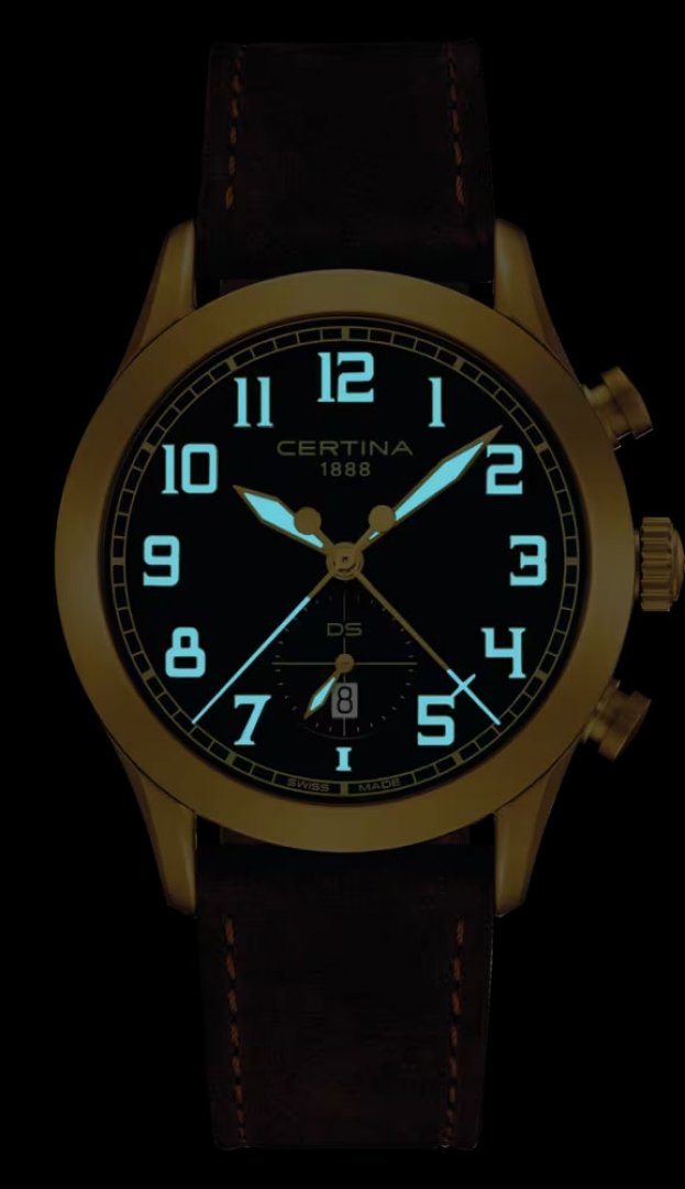 luxusné hodinky Certina DS PILOT Quartz Chronograf, Vode odolnosť 100M, 43 mm. Hodinky disponujú funkciami luminiscencia, stopky a ukazovateľ dátumu. Základné parametre hodín sú: farba ciferníka je zelená, typ strojčeka je Quartz chronograf, materiál remienka je koža a vode odolnosť je 100 m.