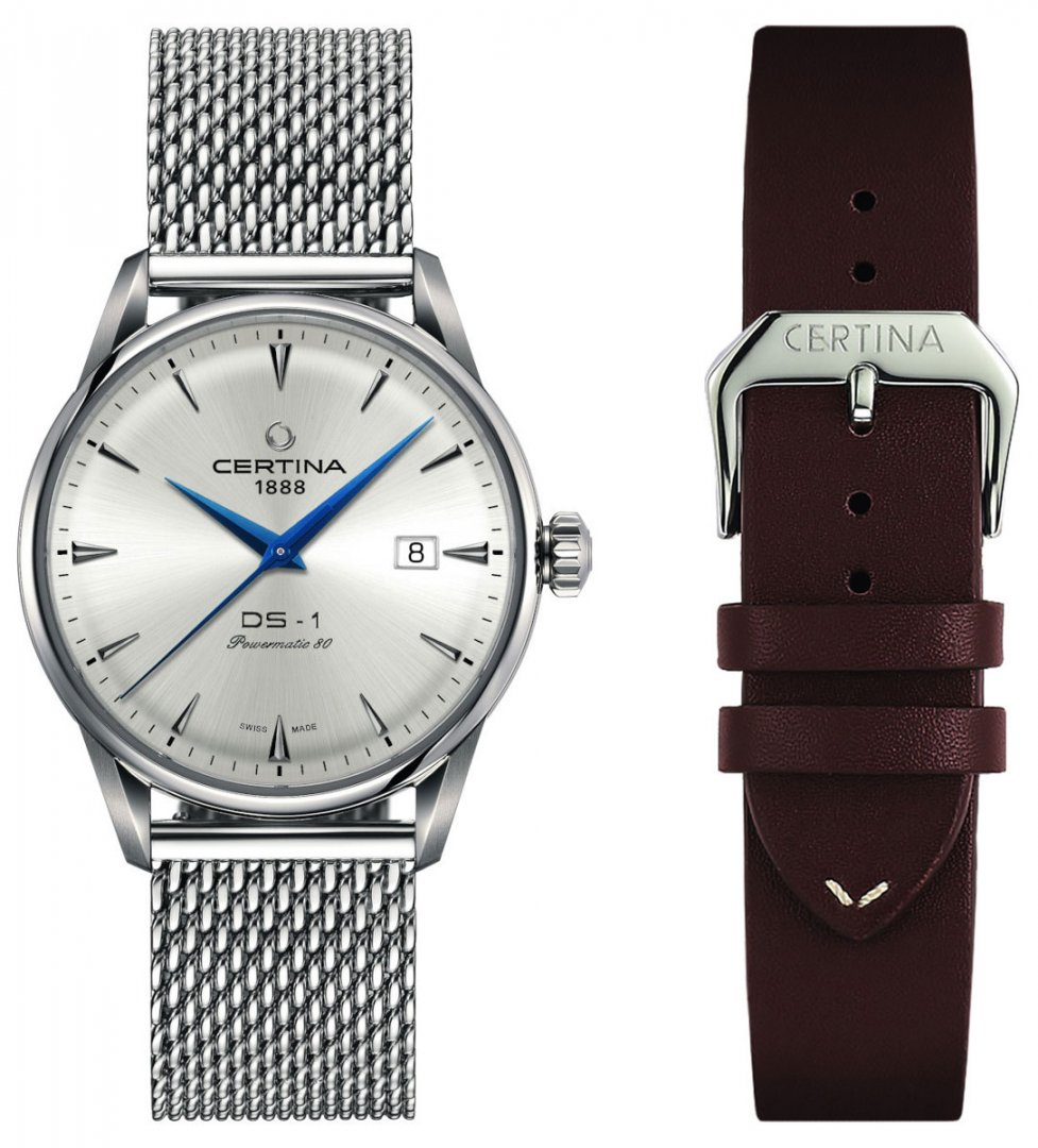Luxusné hodinky Certina DS-1 Powermatic 80 Automat, Vode odolnosť 100M, 40 mm. Hodinky disponujú funkciami ukazovateľ dátumu. Základné parametre hodín sú: farba ciferníka je strieborná, typ strojčeka je mechanické hodinky s automatickým náťahom, materiál remienka je koža a oceľ a vode odolnosť je 100 m.