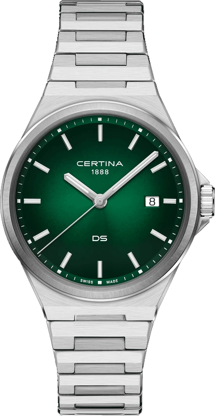 luxusné hodinky Certina DS-7 Quartz, Vode odolnosť 100M, 39 mm. Hodinky disponujú funkciami luminiscencia, ukazovateľ dátumu a E.O.L.. Základné parametre hodín sú: typ strojčeka je Quartz hodinky, materiál remienka je oceľ, vode odolnosť je 100 m a farba ciferníka je zelená.
