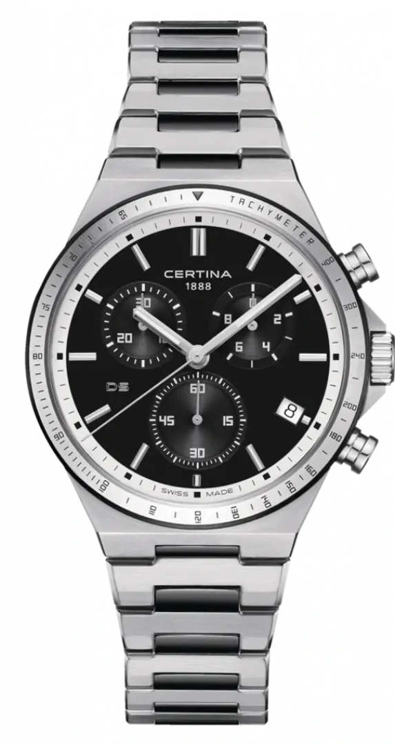 luxusné hodinky Certina DS-7 Quartz Chronograf, Vode odolnosť 100M, 41 mm. Hodinky disponujú funkciami luminiscencia, stopky, tachymeter, ukazovateľ dátumu a E.O.L.. Základné parametre hodín sú: farba ciferníka je strieborná a čierna, typ strojčeka je Quartz chronograf, materiál remienka je oceľ a vode odolnosť je 100 m.