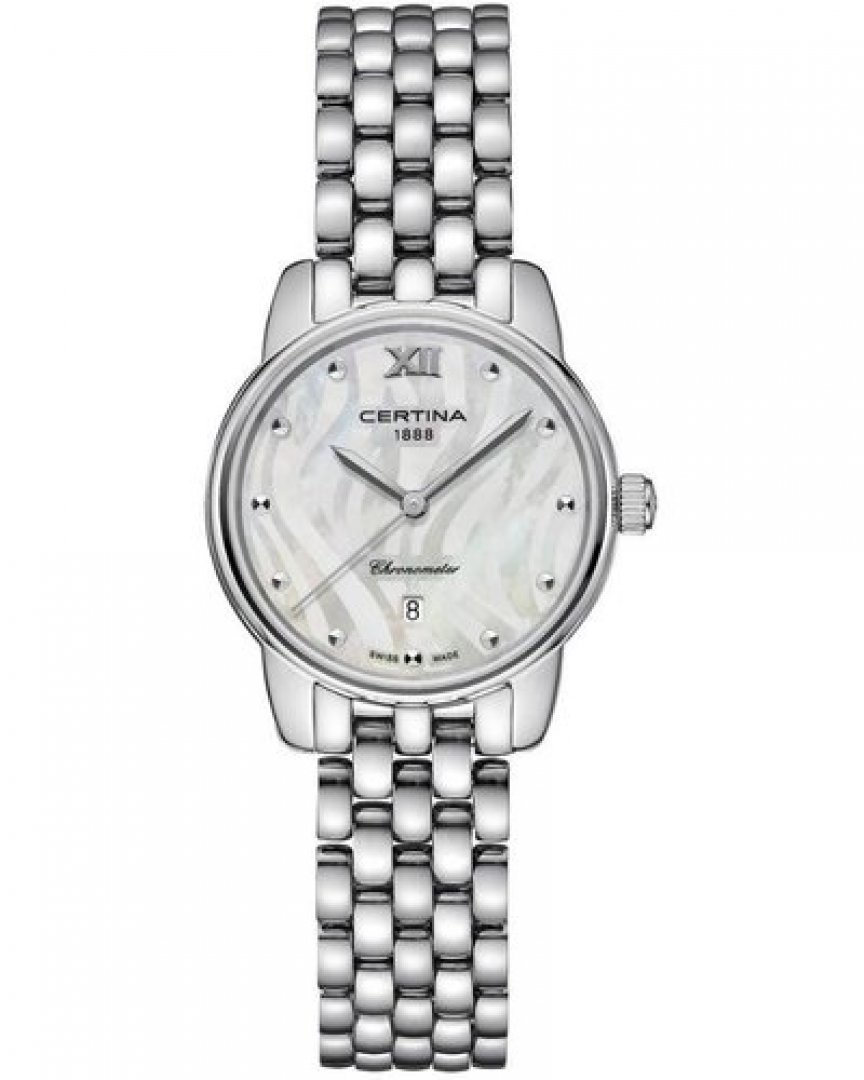 Luxusné hodinky Certina DS-8 Quartz, Chronometer, 27 mm. Hodinky disponujú funkciami ukazovateľ dátumu a E.O.L.. Základné parametre hodín sú: farba ciferníka je perleť, typ strojčeka je Quartz hodinky, materiál remienka je oceľ a vode odolnosť je 100 m.