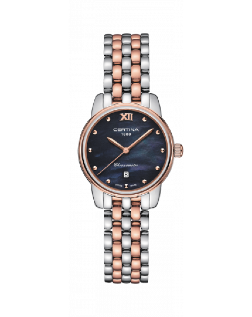 Luxusné hodinky Certina DS-8 Quartz, Chronometer, 27 mm. Hodinky disponujú funkciami ukazovateľ dátumu a E.O.L.. Základné parametre hodín sú: typ strojčeka je Quartz hodinky, materiál remienka je oceľ, vode odolnosť je 100 m a farba ciferníka je modrá a perleť.