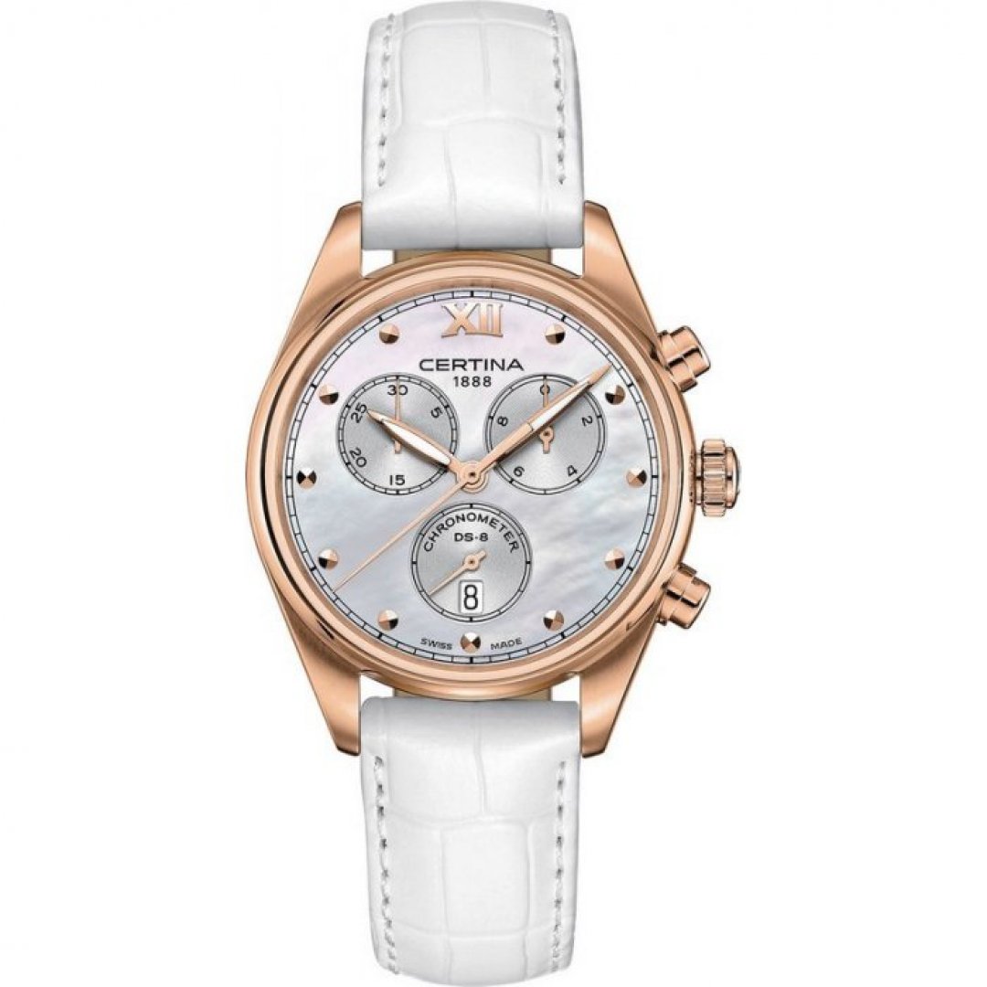 Luxusné hodinky Certina DS-8 Chronometer, Quartz Chronograf, 35 mm. Hodinky disponujú funkciami luminiscencia, stopky a ukazovateľ dátumu. Základné parametre hodín sú: farba ciferníka je perleť, typ strojčeka je Quartz chronograf, materiál remienka je koža a vode odolnosť je 100 m.