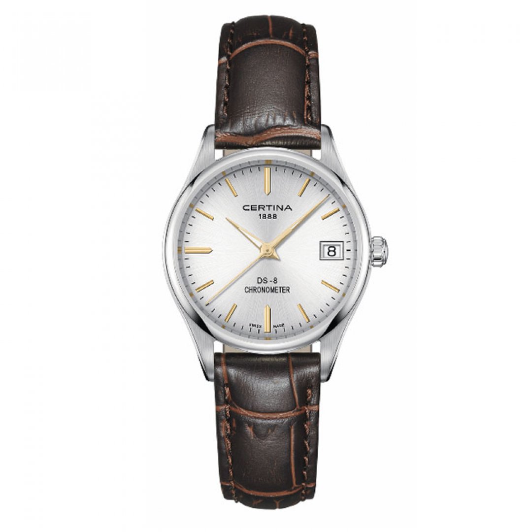 Luxusné hodinky Certina DS-8 Chronometer, Quartz, 30 mm. Hodinky disponujú funkciami luminiscencia a ukazovateľ dátumu. Základné parametre hodín sú: typ strojčeka je Quartz hodinky, materiál remienka je koža, vode odolnosť je 100 m a farba ciferníka je strieborná.