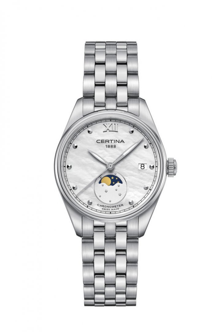 Luxusné hodinky Certina DS-8 Chronometer, Quartz, 32 mm. Hodinky disponujú funkciami luminiscencia, ukazovateľ dátumu a mesačné fázy. Základné parametre hodín sú: farba ciferníka je perleť, vode odolnosť je 100 m, materiál remienka je oceľ a typ strojčeka je Quartz hodinky.