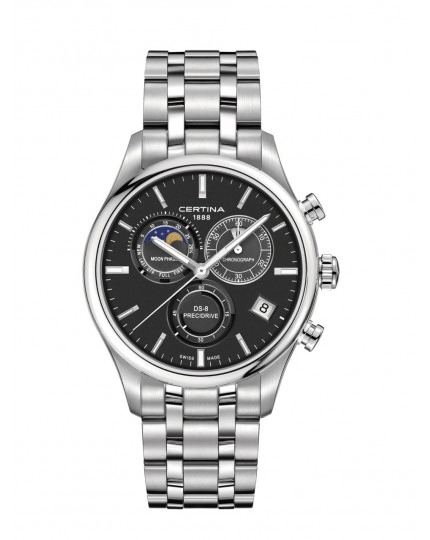 Luxusné hodinky Certina DS-8 Mesačné fázy, Quartz Chronograf, 42 mm. Hodinky disponujú funkciami luminiscencia, mesačné fázy, stopky, ukazovateľ dátumu a E.O.L.. Základné parametre hodín sú: typ strojčeka je Quartz chronograf, materiál remienka je oceľ, vode odolnosť je 100 m a farba ciferníka je čierna.