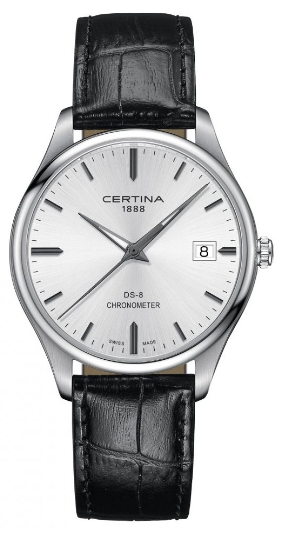 luxusné hodinky Certina DS-8 Quartz, COSC, 40.2 mm. Hodinky disponujú funkciami ukazovateľ dátumu a E.O.L.. Základné parametre hodín sú: typ strojčeka je Quartz hodinky, vode odolnosť je 100 m, materiál remienka je koža a farba ciferníka je strieborná.