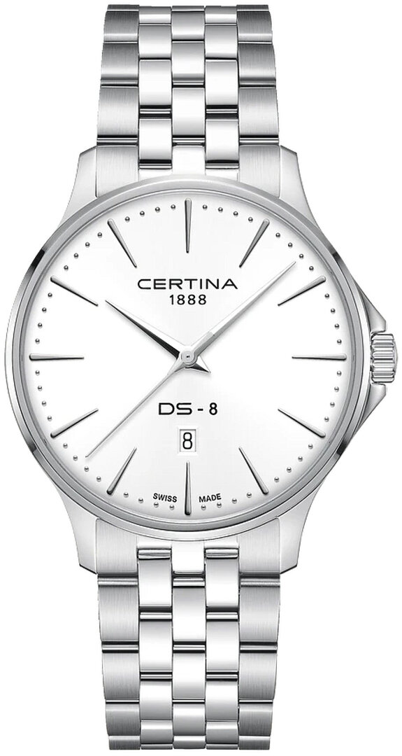 luxusné hodinky Certina DS-8 Gent Quartz, 40 mm. Hodinky disponujú funkciami ukazovateľ dátumu a E.O.L.. Základné parametre hodín sú: typ strojčeka je Quartz hodinky, materiál remienka je oceľ, vode odolnosť je 100 m a farba ciferníka je strieborná.