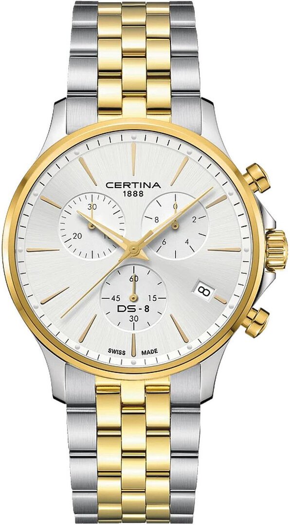 luxusné hodinky Certina DS-8 Gent Precidrive COSC Chronograph Quartz Chronograf, 41 mm. Hodinky disponujú funkciami ukazovateľ dátumu, E.O.L. a stopky. Základné parametre hodín sú: materiál remienka je oceľ, vode odolnosť je 100 m, typ strojčeka je Quartz chronograf a farba ciferníka je strieborná.