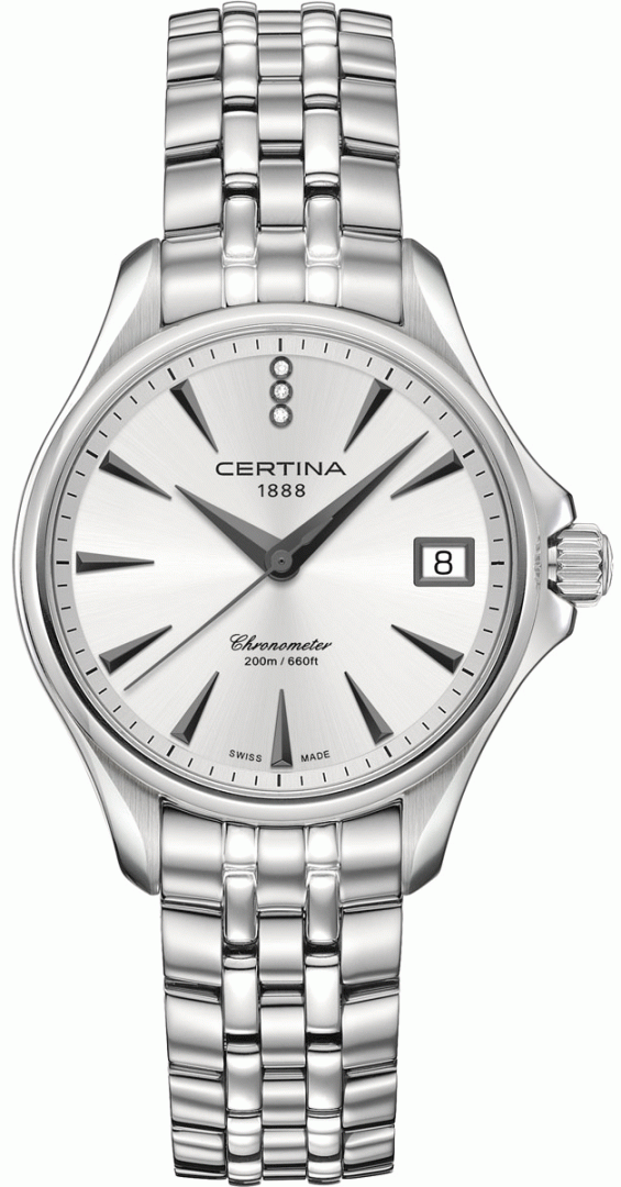 Luxusné hodinky Certina DS Action Quartz, Chronometer, Diamanty, 33.80 mm. Hodinky disponujú funkciami luminiscencia, ukazovateľ dátumu a E.O.L.. Základné parametre hodín sú: farba ciferníka je strieborná, typ strojčeka je Quartz hodinky, materiál remienka je oceľ a vode odolnosť je 200 m.
