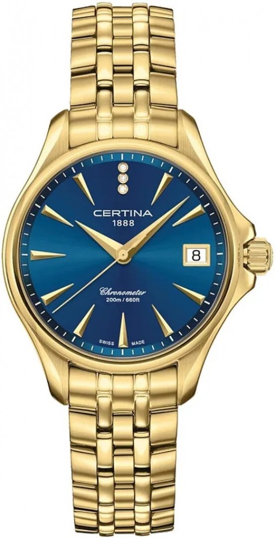 luxusné hodinky Certina DS Action Quartz, Chronometer, Diamanty, 33.80 mm. Hodinky disponujú funkciami luminiscencia, ukazovateľ dátumu a E.O.L.. Základné parametre hodín sú: typ strojčeka je Quartz hodinky, materiál remienka je oceľ, vode odolnosť je 200 m a farba ciferníka je modrá.