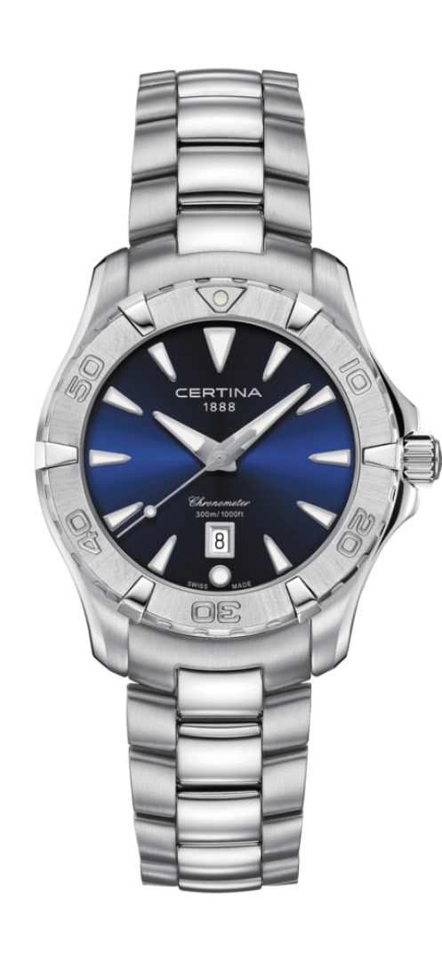 Luxusné hodinky Certina DS Action Quartz, Vode odolnosť 300M, 34 mm. Hodinky disponujú funkciami luminiscencia, ukazovateľ dátumu a E.O.L.. Základné parametre hodín sú: typ strojčeka je Quartz hodinky, vode odolnosť je 300 m, materiál remienka je oceľ a farba ciferníka je modrá.