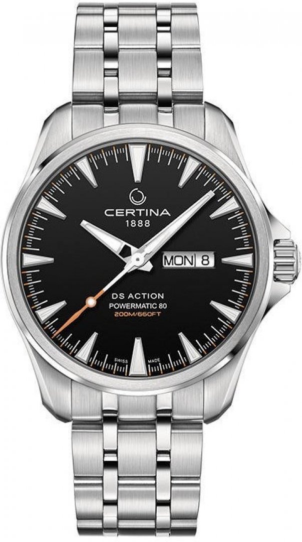 Luxusné hodinky Certina DS Action Powermatic 80, Vode odolnosť 200M, 41 mm. Hodinky disponujú funkciami luminiscencia, ukazovateľ dátumu a Day-Date. Základné parametre hodín sú: typ strojčeka je mechanické hodinky s automatickým náťahom, materiál remienka je koža, vode odolnosť je 200 m a farba ciferníka je čierna.