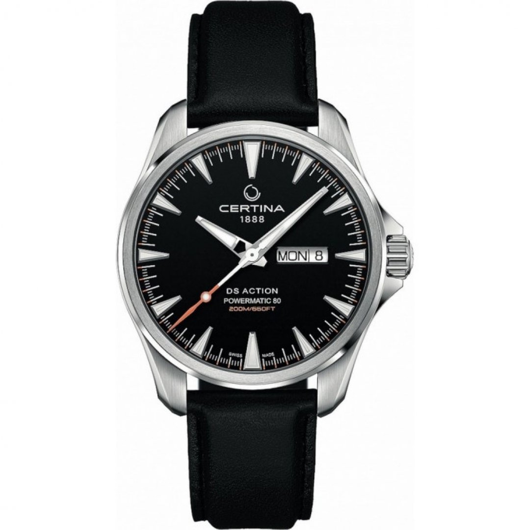 Luxusné hodinky Certina DS Action Powermatic 80, Vode odolnosť 200M, 41 mm. Hodinky disponujú funkciami luminiscencia, ukazovateľ dátumu a Day-Date. Základné parametre hodín sú: farba ciferníka je čierna, typ strojčeka je mechanické hodinky s automatickým náťahom, materiál remienka je koža a vode odolnosť je 200 m.