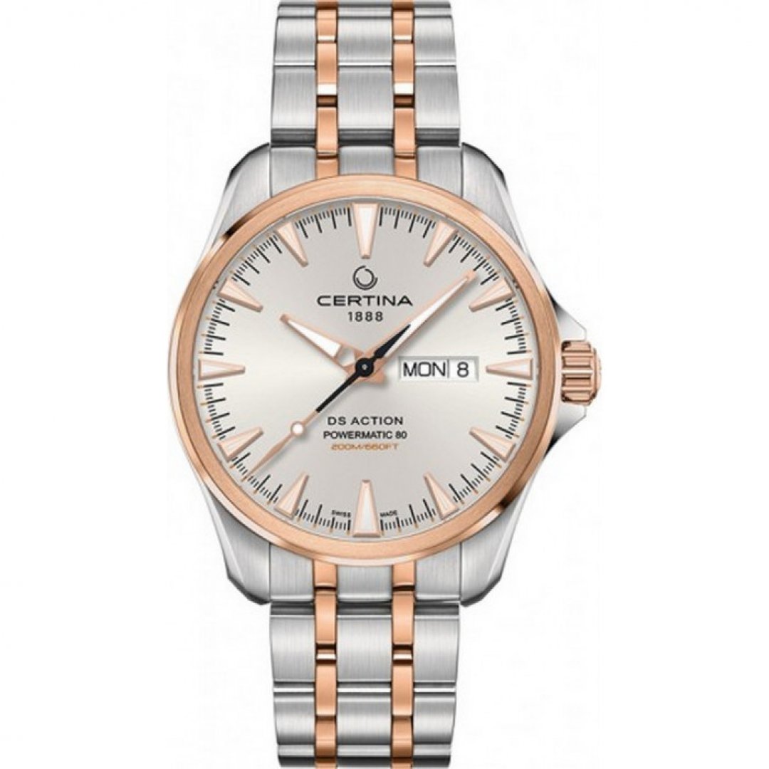 Športové hodinky švajčiarske hodinky Certina DS Action Powermatic 80, Vode odolnosť 200M, 41 mm. Hodinky disponujú funkciami luminiscencia, ukazovateľ dátumu a Day-Date. Základné parametre hodín sú: typ strojčeka je Quartz hodinky, vode odolnosť je 200 m, farba ciferníka je strieborná a materiál remienka je oceľ.