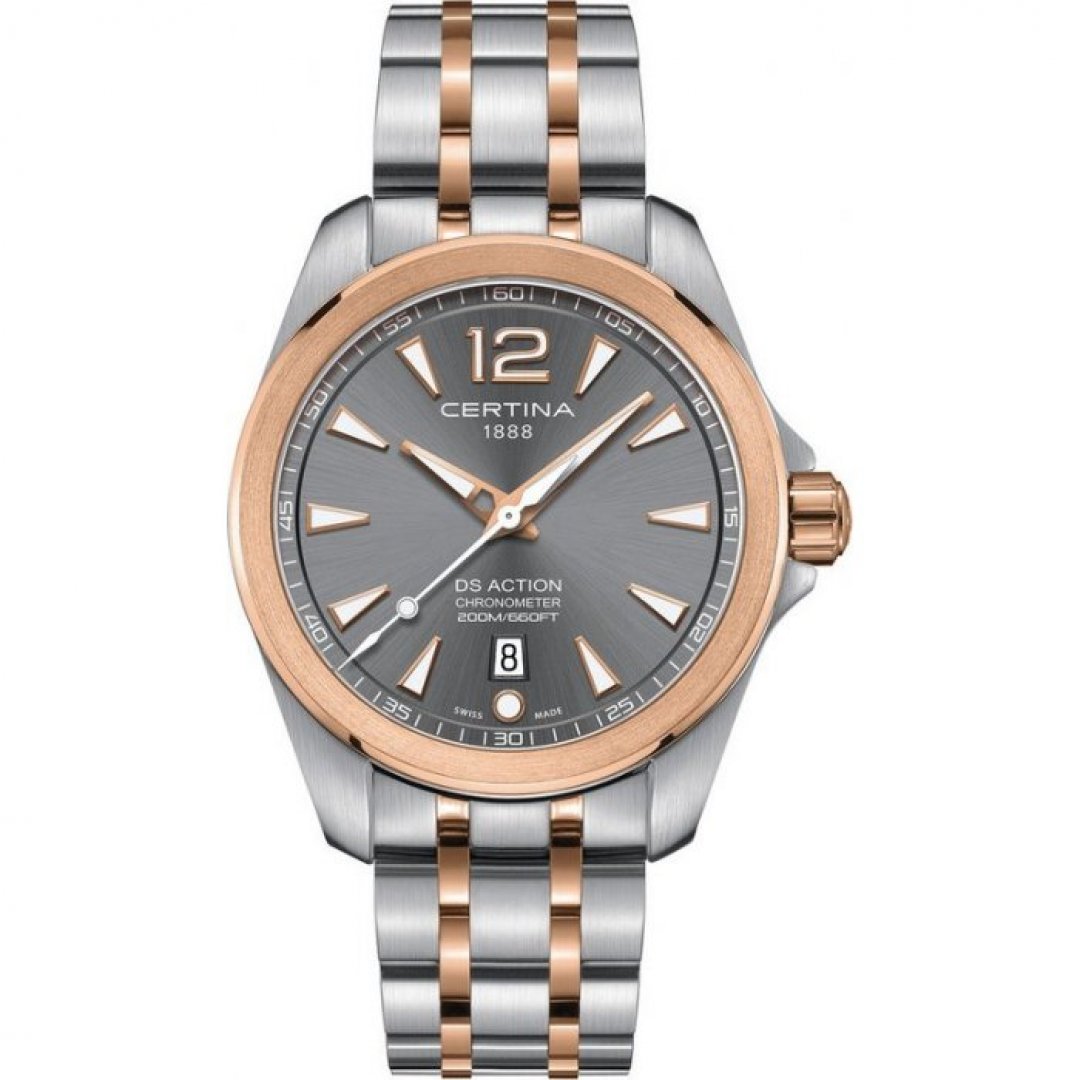 Luxusné hodinky Certina DS Action Chronometer, Quartz, 41 mm. Hodinky disponujú funkciami luminiscencia a ukazovateľ dátumu. Základné parametre hodín sú: typ strojčeka je Quartz hodinky, materiál remienka je oceľ, vode odolnosť je 200 m a farba ciferníka je šedá.