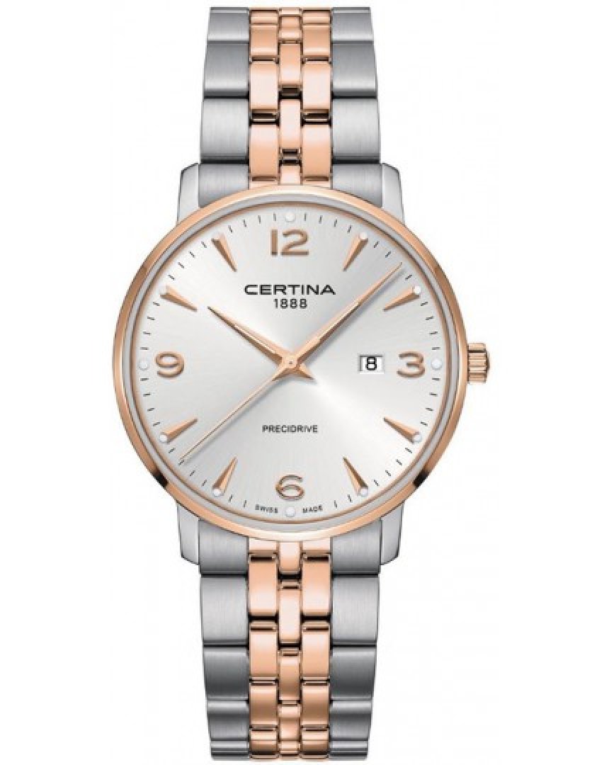 Luxusné hodinky Certina DS Caimano Precidrive, Quartz, 39 mm. Hodinky disponujú funkciami ukazovateľ dátumu a E.O.L.. Základné parametre hodín sú: farba ciferníka je strieborná, typ strojčeka je Quartz hodinky, materiál remienka je oceľ a vode odolnosť je 100 m.