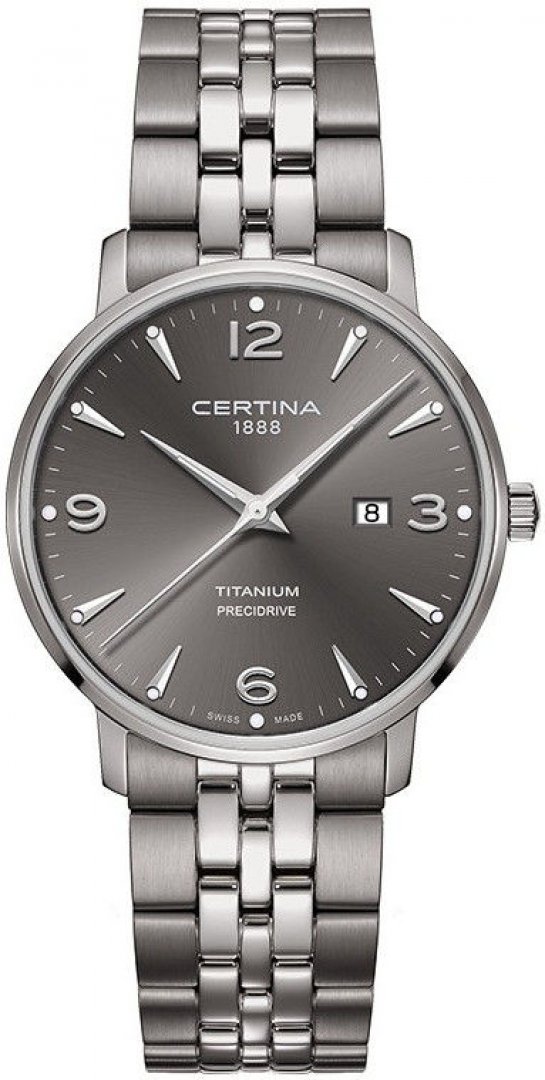 Luxusné hodinky Certina DS Caimano Quartz, Vode odolnosť 100M, 39 mm. Hodinky disponujú funkciami luminiscencia, ukazovateľ dátumu a E.O.L.. Základné parametre hodín sú: farba ciferníka je šedá, typ strojčeka je Quartz hodinky, materiál remienka je titan a vode odolnosť je 100 m.