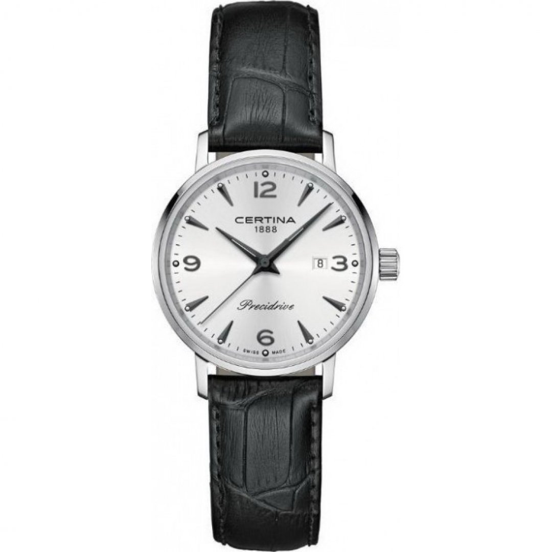 Luxusné hodinky Certina DS Caimano Lady Quartz, Vode odolnosť 100M, 28 mm. Hodinky disponujú funkciami luminiscencia, ukazovateľ dátumu a E.O.L.. Základné parametre hodín sú: farba ciferníka je strieborná, typ strojčeka je Quartz hodinky, materiál remienka je koža a vode odolnosť je 100 m.
