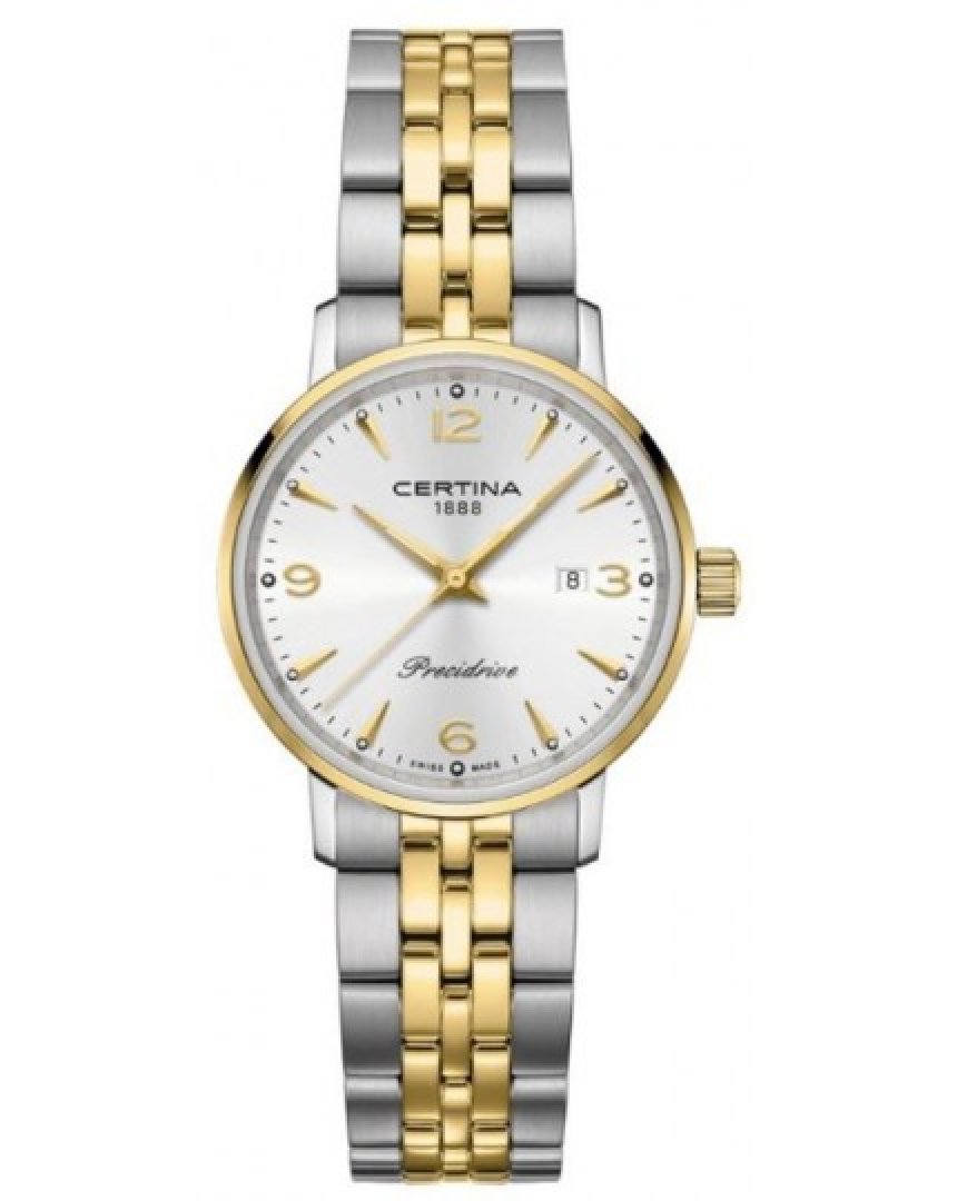 Luxusné hodinky Certina DS Caimano Lady Precidrive, Quartz, 28 mm. Hodinky disponujú funkciami ukazovateľ dátumu a E.O.L.. Základné parametre hodín sú: farba ciferníka je strieborná, typ strojčeka je Quartz hodinky, materiál remienka je oceľ a vode odolnosť je 100 m.