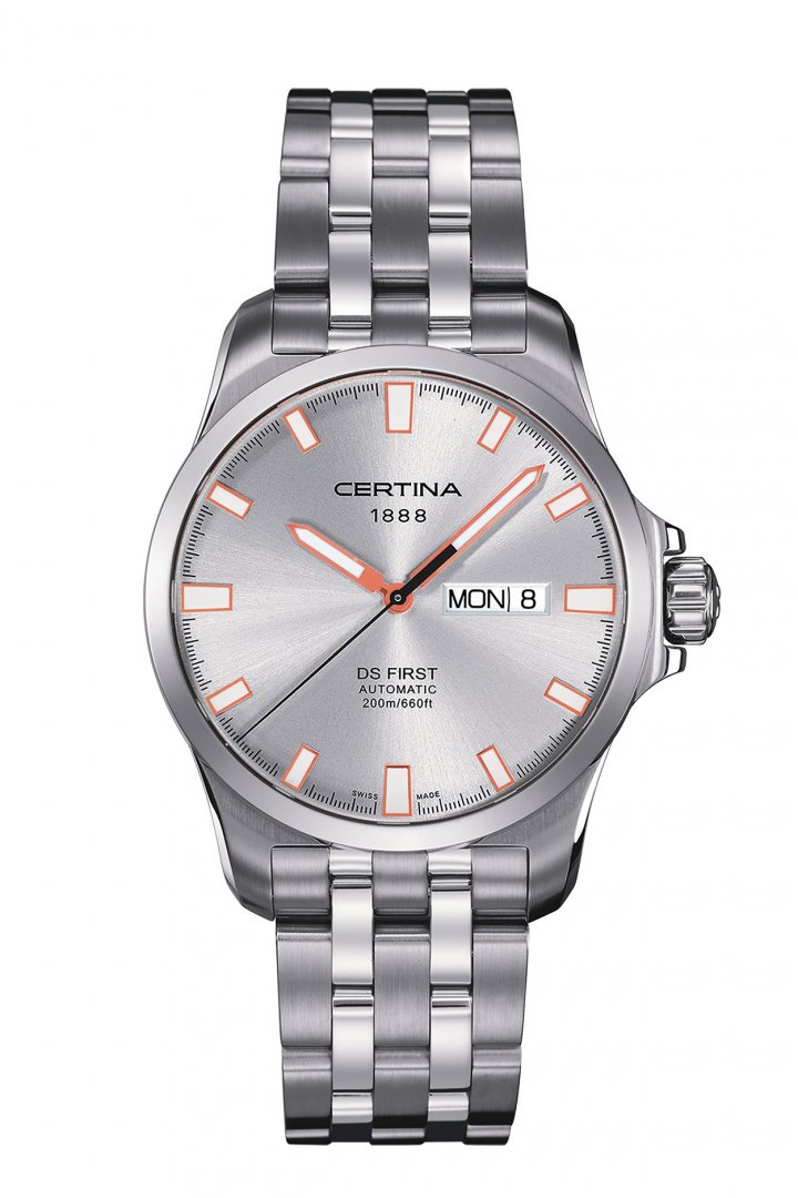 Luxusné hodinky Certina DS First Day-Date, Automat, 40 mm. Hodinky disponujú funkciami Day-Date. Základné parametre hodín sú: farba ciferníka je strieborná, typ strojčeka je mechanické hodinky s automatickým náťahom, materiál remienka je oceľ a vode odolnosť je 200 m.