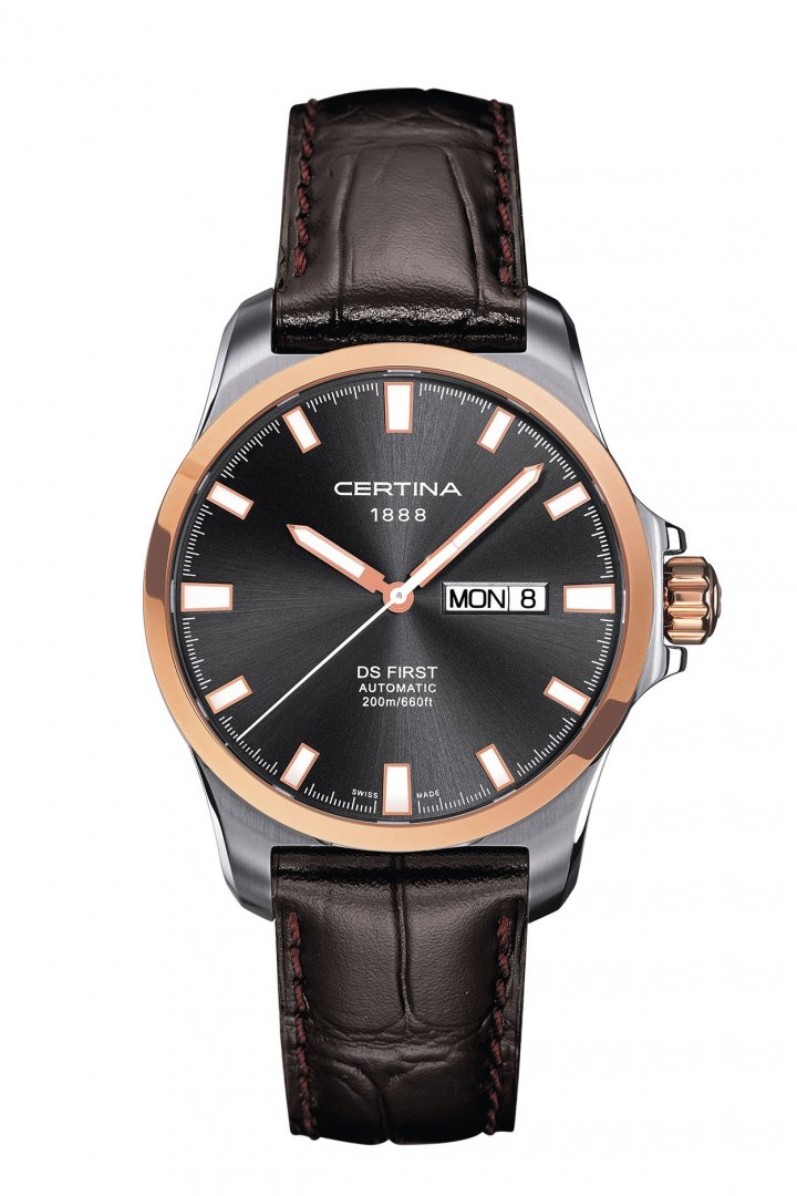 Luxusné hodinky Certina DS First Day-Date, Automat, 40 mm. Hodinky disponujú funkciami Day-Date. Základné parametre hodín sú: typ strojčeka je mechanické hodinky s automatickým náťahom, vode odolnosť je 200 m, farba ciferníka je šedá a materiál remienka je koža.
