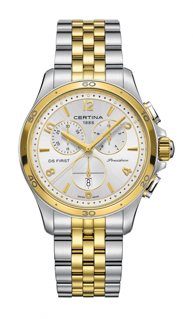 Luxusné hodinky Certina DS First Lady Vode odolnosť 100M, Quartz Chronograf, 38 mm. Hodinky disponujú funkciami stopky a ukazovateľ dátumu. Základné parametre hodín sú: typ strojčeka je Quartz chronograf, vode odolnosť je 100 m, farba ciferníka je strieborná a materiál remienka je oceľ.