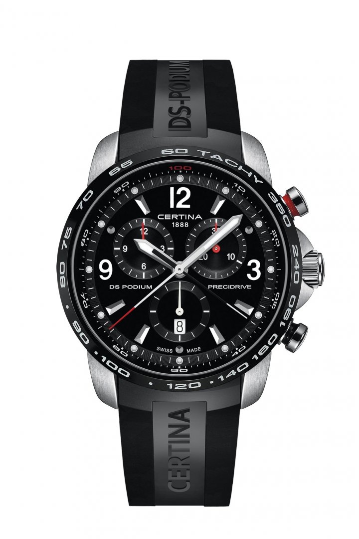 Luxusné hodinky Certina DS Podium Quartz Chronograf, Vode odolnosť 100M, 43.5 mm. Hodinky disponujú funkciami luminiscencia, ukazovateľ dátumu, stopky, tachymeter a E.O.L.. Základné parametre hodín sú: typ strojčeka je Quartz chronograf, vode odolnosť je 200 m, farba ciferníka je čierna a materiál remienka je kaučuk.