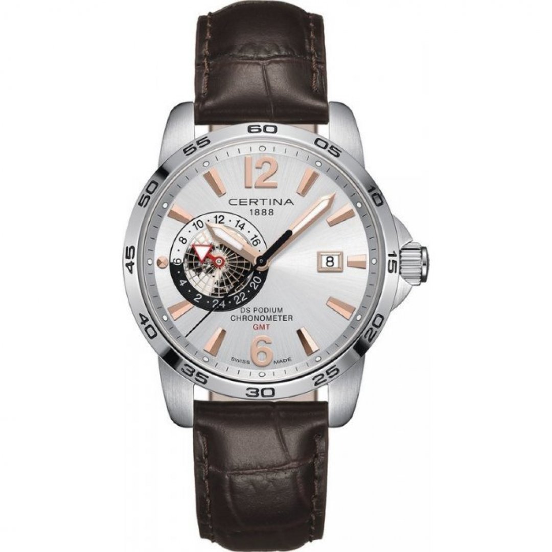 Luxusné hodinky Certina DS Podium Chronometer, Quartz, 41 mm. Hodinky disponujú funkciami duálny čas, luminiscencia a ukazovateľ dátumu. Základné parametre hodín sú: typ strojčeka je Quartz hodinky, materiál remienka je koža, vode odolnosť je 100 m a farba ciferníka je strieborná.