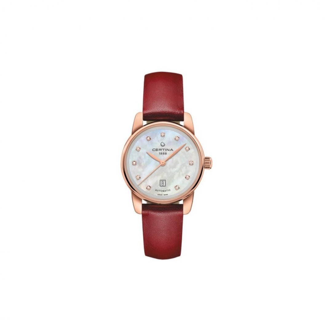 Luxusné hodinky Certina DS Podium Lady Diamanty, Automat, 29 mm. Hodinky disponujú funkciami ukazovateľ dátumu. Základné parametre hodín sú: farba ciferníka je perleť, typ strojčeka je mechanické hodinky s automatickým náťahom, materiál remienka je koža a vode odolnosť je 100 m.