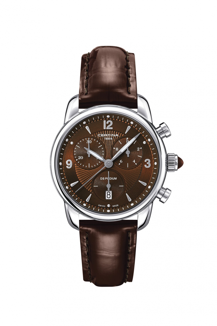 Módne hodinky Certina DS Podium Lady Arabské číslice, Quartz Chronograf, 34.5 mm. Hodinky disponujú funkciami luminiscencia, ukazovateľ dátumu, E.O.L. a stopky. Základné parametre hodín sú: vode odolnosť je 100 m, typ strojčeka je Quartz chronograf, materiál remienka je koža a farba ciferníka je hnědá.