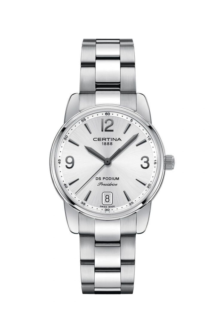 Módne hodinky Certina DS Podium Lady Vode odolnosť 100M, Quartz, 33 mm. Hodinky disponujú funkciami ukazovateľ dátumu a E.O.L.. Základné parametre hodín sú: farba ciferníka je perleť, typ strojčeka je Quartz hodinky, materiál remienka je oceľ a vode odolnosť je 100 m.