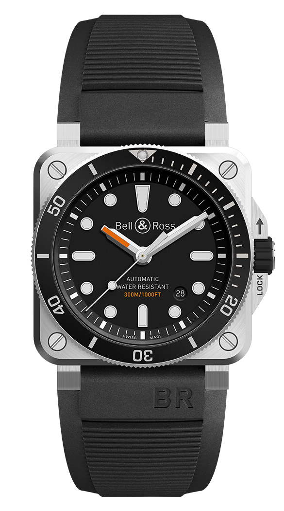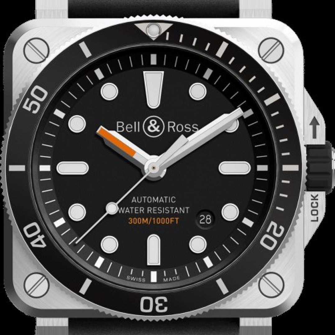 luxusní hodinky Bell & Ross BR 03 DIVER Ocel, Vode odolnost 300M, 42 mm. Hodinky disponují funkcemi luminiscence a ukazatel data. Základní parametry hodinek jsou: typ strojku je mechanické hodinky s automatickým nátahem, materiál řemínku je textil a kaučuk, barva číselníku je černá a vodotěsnost je 300 m.
