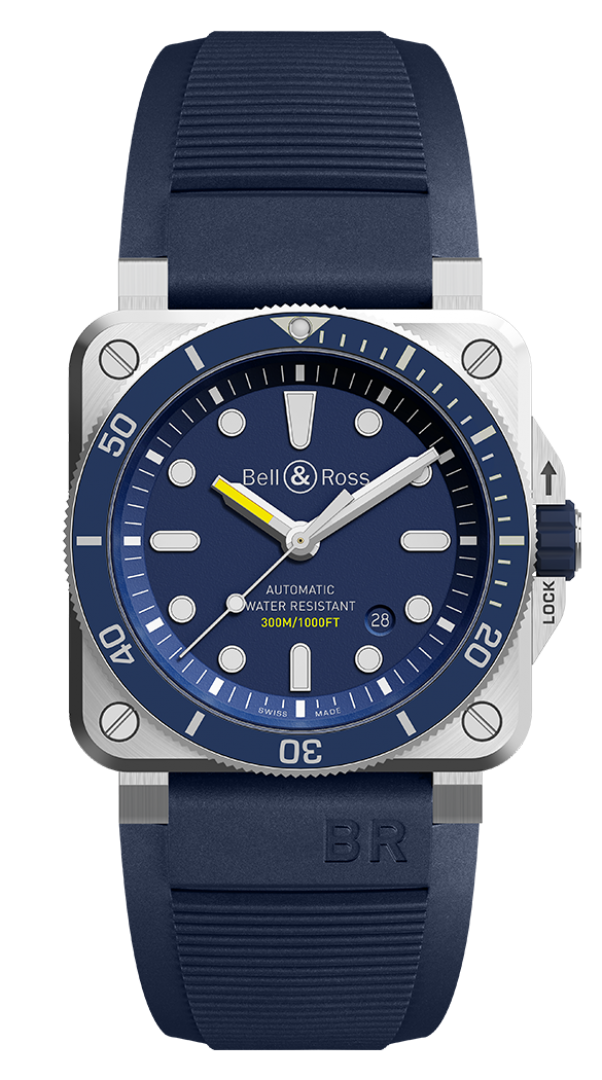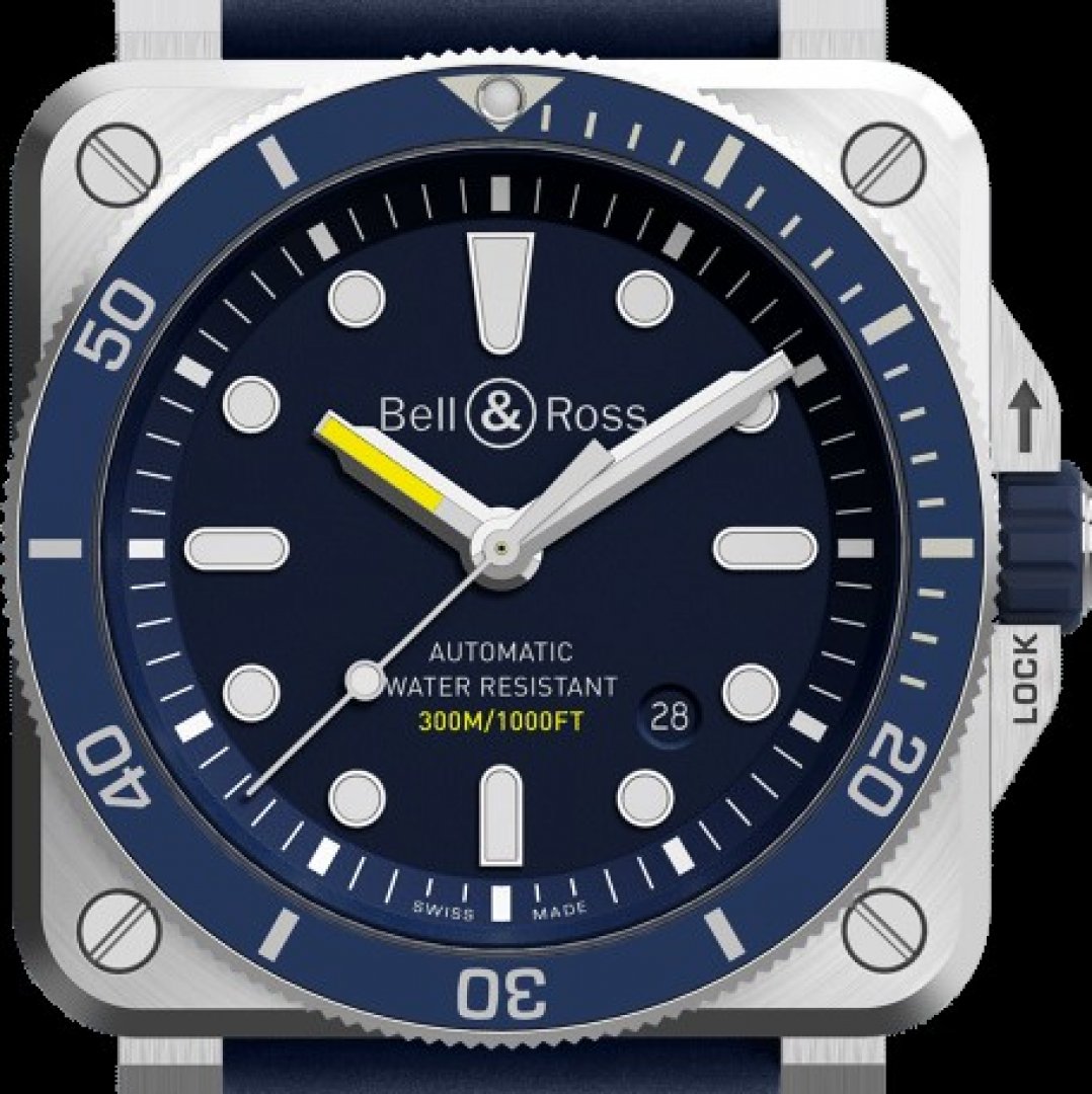 luxusní hodinky Bell & Ross BR 03 DIVER BLUE Ocel, Vode odolnost 300M, 42 mm. Hodinky disponují funkcemi luminiscence a ukazatel data. Základní parametry hodinek jsou: typ strojku je mechanické hodinky s automatickým nátahem, materiál řemínku je textil a kaučuk, vodotěsnost je 300 m a barva číselníku je modrá.